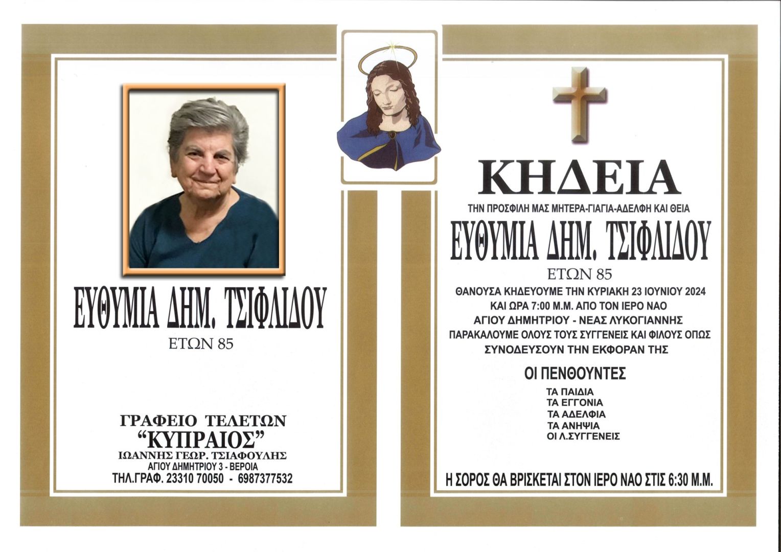 Έφυγε από τη ζωή και κηδεύεται σήμερα Κυριακή 23 Ιουνίου 2024 στις 7.00 μμ. από τον Ιερό Ναό Αγίου Δημητρίου Νέας Λυκογιάννης η Ευθυμία Δημ. Τσιφλίδου σε ηλικία 85 ετών.