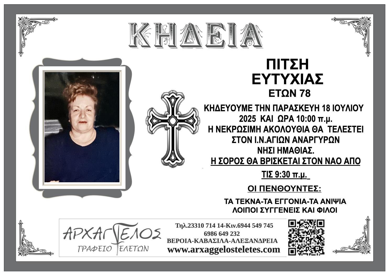 Έφυγε από τη ζωή και κηδεύεται την Παρασκευή 18 Ιουλίου 2025 στις 10.00 π.μ. από τον Ιερό Ναό Αγίων Αναργύρων στο Νησί Ημαθίας η Ευτυχία Πίτση σε ηλικία 78 ετών.