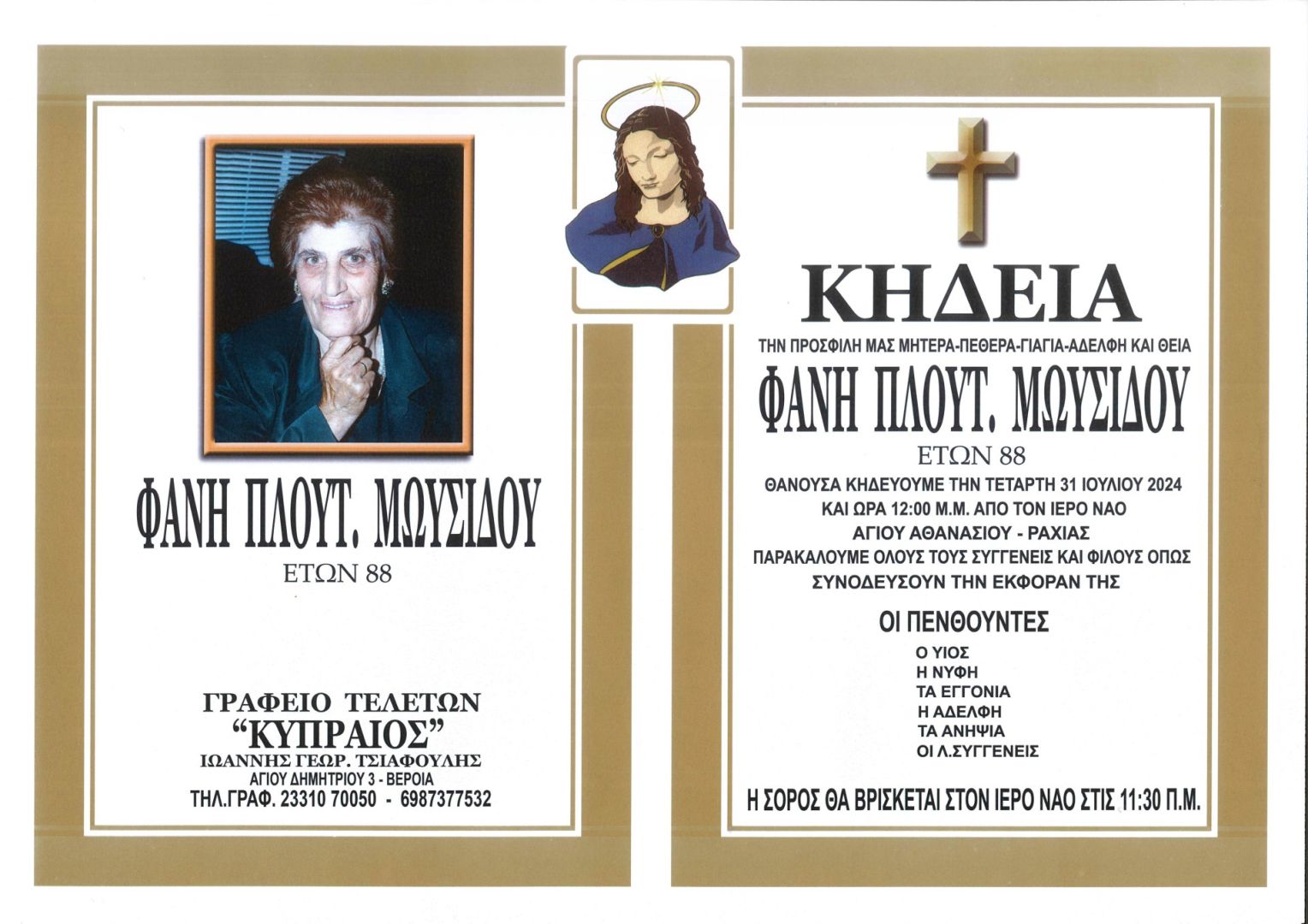 Έφυγε από τη ζωή και κηδεύεται την Τετάρτη 31 Ιουλίου 2024 στις 12.00 μ.μ. από τον Ιερό Ναό Αγίου Αθανασίου Ραχιάς η Φανή Πλουτ. Μωυσίδου σε ηλικία 88 ετών.