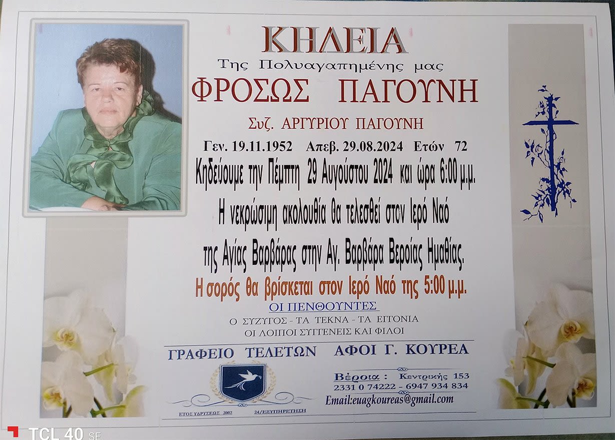 Έφυγε από τη ζωή και κηδεύεται σήμερα Πέμπτη 29 Αυγούστου 2024 στις 6.00 μ.μ. από τον Ιερό Ναό Αγίας Βαρβάρας στην Αγία Βαρβάρα Βέροιας η Φρόσω Παγούνη σε ηλικία 72 ετών.