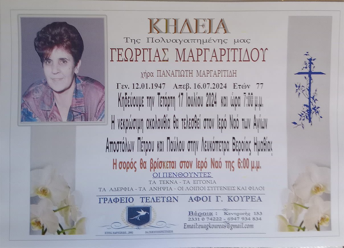 Έφυγε από τη ζωή και κηδεύεται σήμερα Τετάρτη 17 Ιουλίου 2024 στις 7.00 μ.μ. από τον Ιερό Ναό Αγίων Αποστόλων Πέτρου και Παύλου στην Λευκόπετρα Βέροιας η Γεωργία Μαργαριτίδου σε ηλικία 77 ετών.