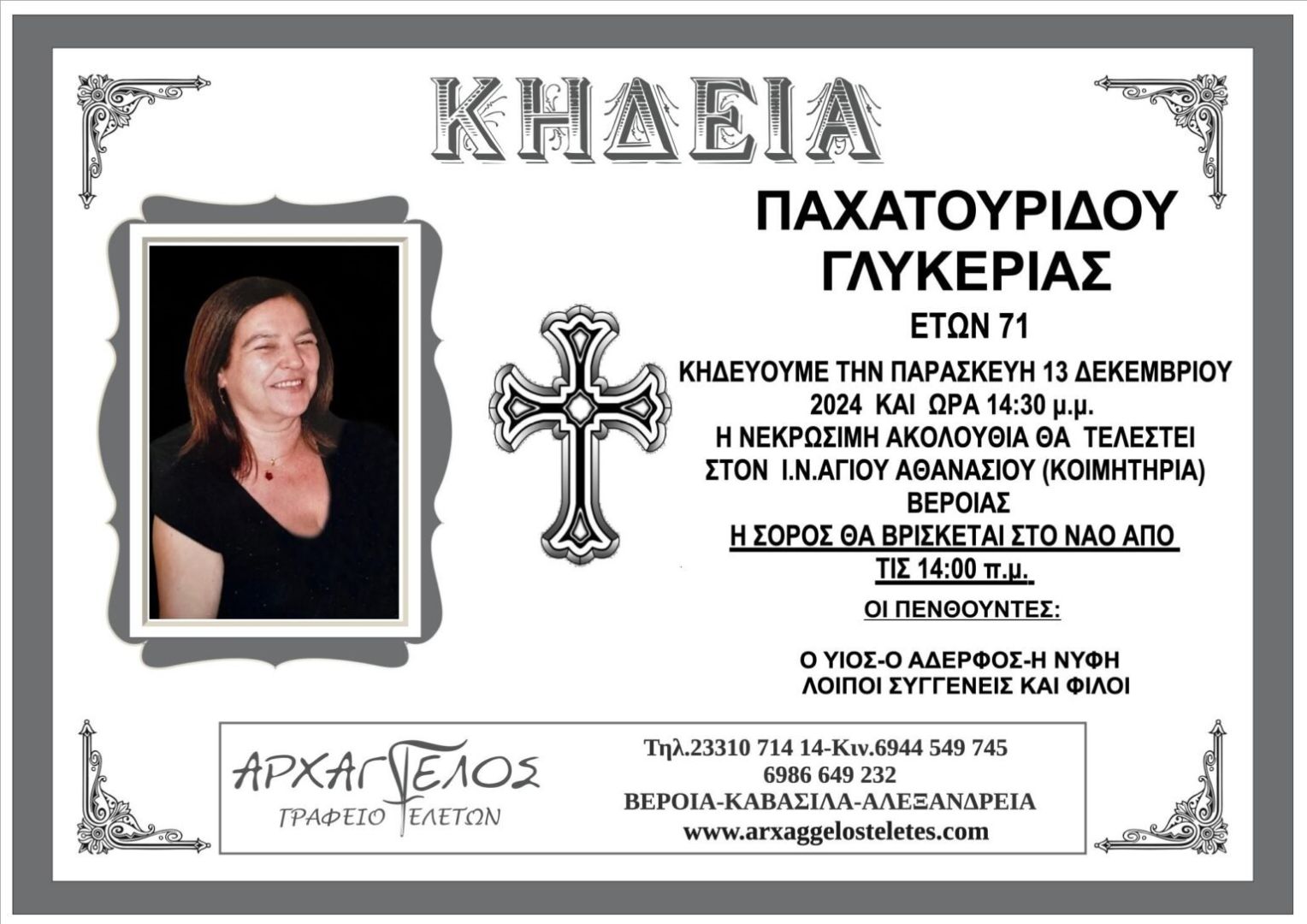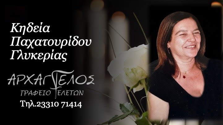 Έφυγε από τη ζωή και κηδεύεται την Παρασκευή 13 Δεκεμβρίου 2024 στις 2.30 μ.μ. από τον Ιερό Ναό Αγίου Αθανασίου (Κοιμητήρια) Βέροιας η Γλυκερία Παχατουρίδου σε ηλικία 71 ετών.
