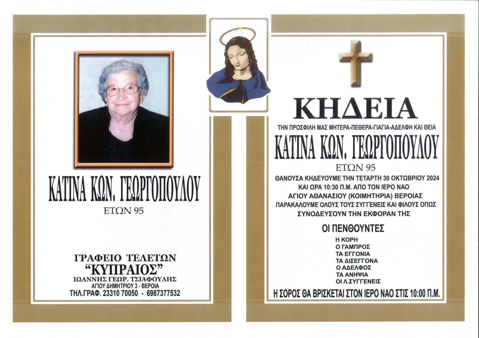 Έφυγε από τη ζωή και κηδεύεται την Τετάρτη 30 Οκτωβρίου 2024 στις 10.30 π.μ. από τον Ιερό Ναό Αγίου Αθανασίου (Κοιμητήρια) Βέροιας η Κατίνα Κων. Γεωργοπούλου σε ηλικία 95 ετών.