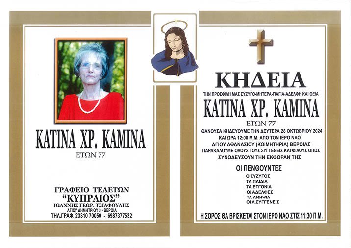 Έφυγε από τη ζωή και κηδεύεται αύριο Δευτέρα 28 Οκτωβρίου 2024 στις 12.00 μ.μ. από τον Ιερό Ναό Αγίου Αθανασίου (Κοιμητήρια) Βέροιας, η Κατίνα Χρ. Κάμινα σε ηλικία 77 ετών.