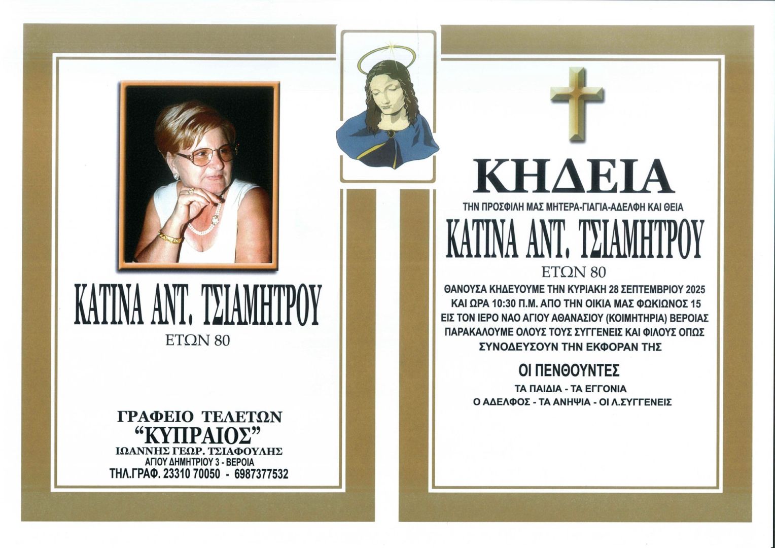Έφυγε από τη ζωή και κηδεύτηκε σήμερα Κυριακή 28 Σεπτεμβρίου 2025 στις 10.30 π.μ. από τον Ιερό Ναό Αγίου Αθανασίου (Κοιμητήρια ) Βέροιας η Κατίνα Αντ. Τσιαμήτρου σε ηλικία 80 ετών.
