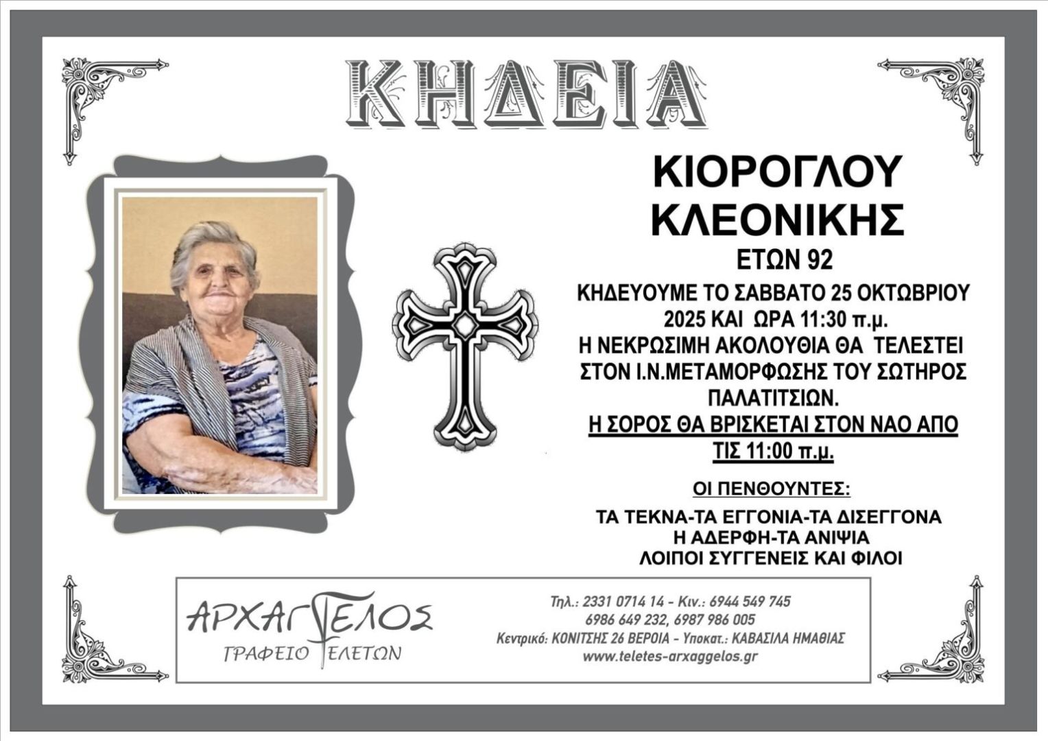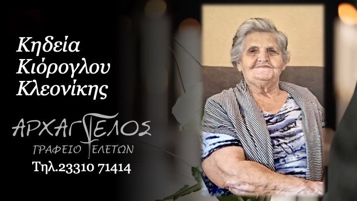 Έφυγε από τη ζωή και κηδεύεται το Σάββατο 25 Οκτωβρίου 2025 στις 11.30 π.μ. από τον Ιερό Ναό Μεταμόρφωσης του Σωτήρος Παλατιτσίων η Κλεονίκη Κιόρογλου σε ηλικία 92 ετών.