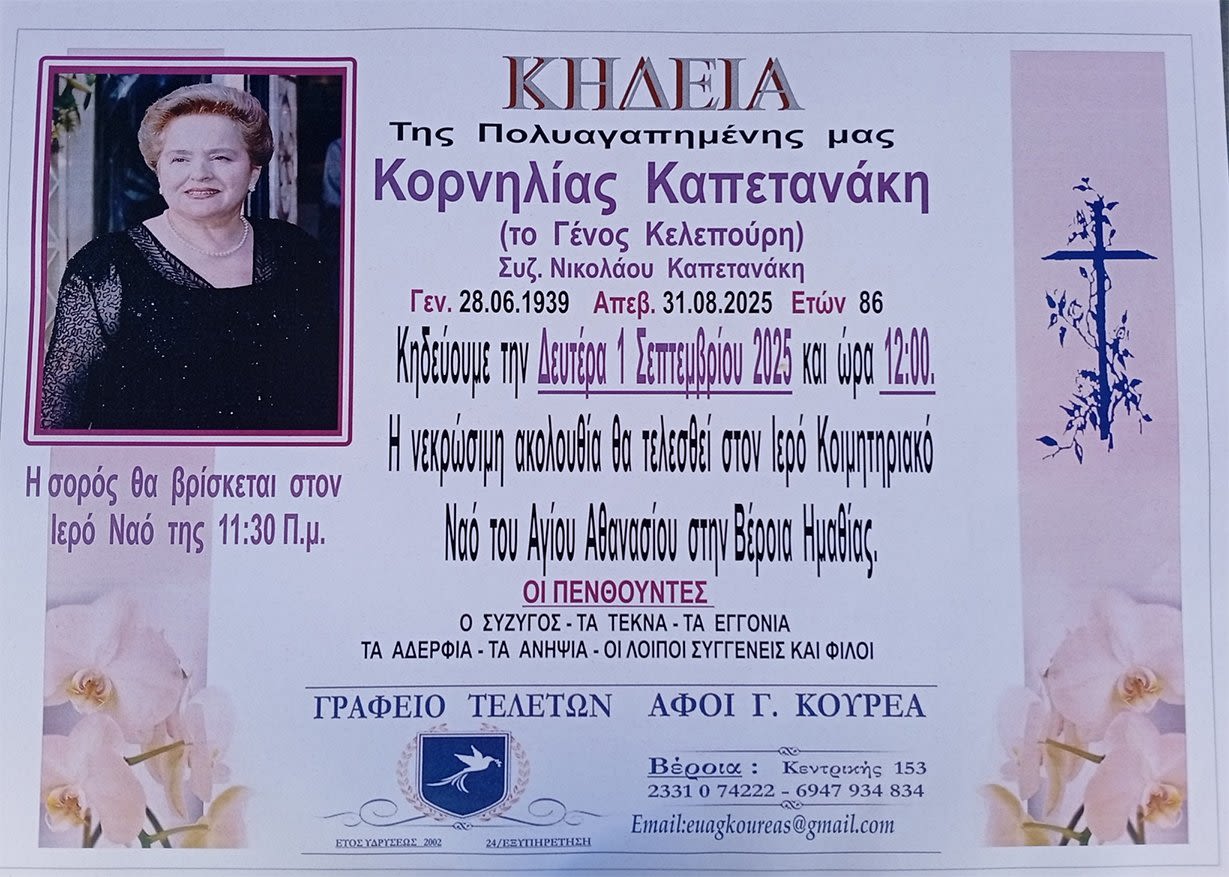 Έφυγε από τη ζωή και κηδεύεται την Δευτέρα 1 Σεπτεμβρίου 2025 στις 12.00 μ.μ. από τον Ιερό Ναό Αγίου Αθανασίου (Κοιμητήρια) Βέροιας η Κορνηλία Καπετανάκη σε ηλικία 86 ετών.