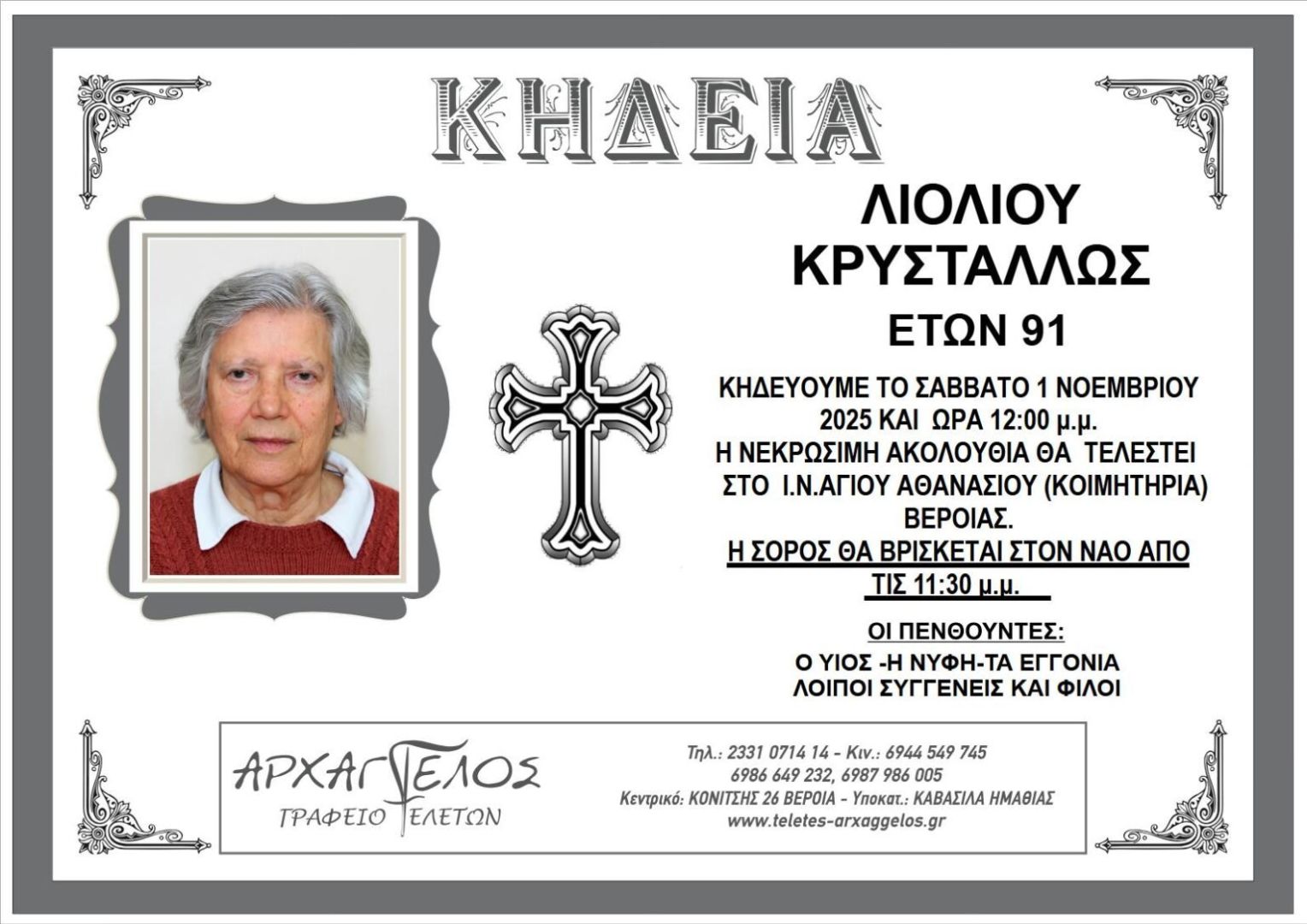 Έφυγε από τη ζωή και κηδεύεται το Σάββατο 1 Νοεμβρίου 2025 στις 12.00 μ.μ. από τον Ιερό Ναό Αγίου Αθανασίου (Κοιμητήρια) Βέροιας η Κρυστάλλω Λιόλιου σε ηλικία 91 ετών.