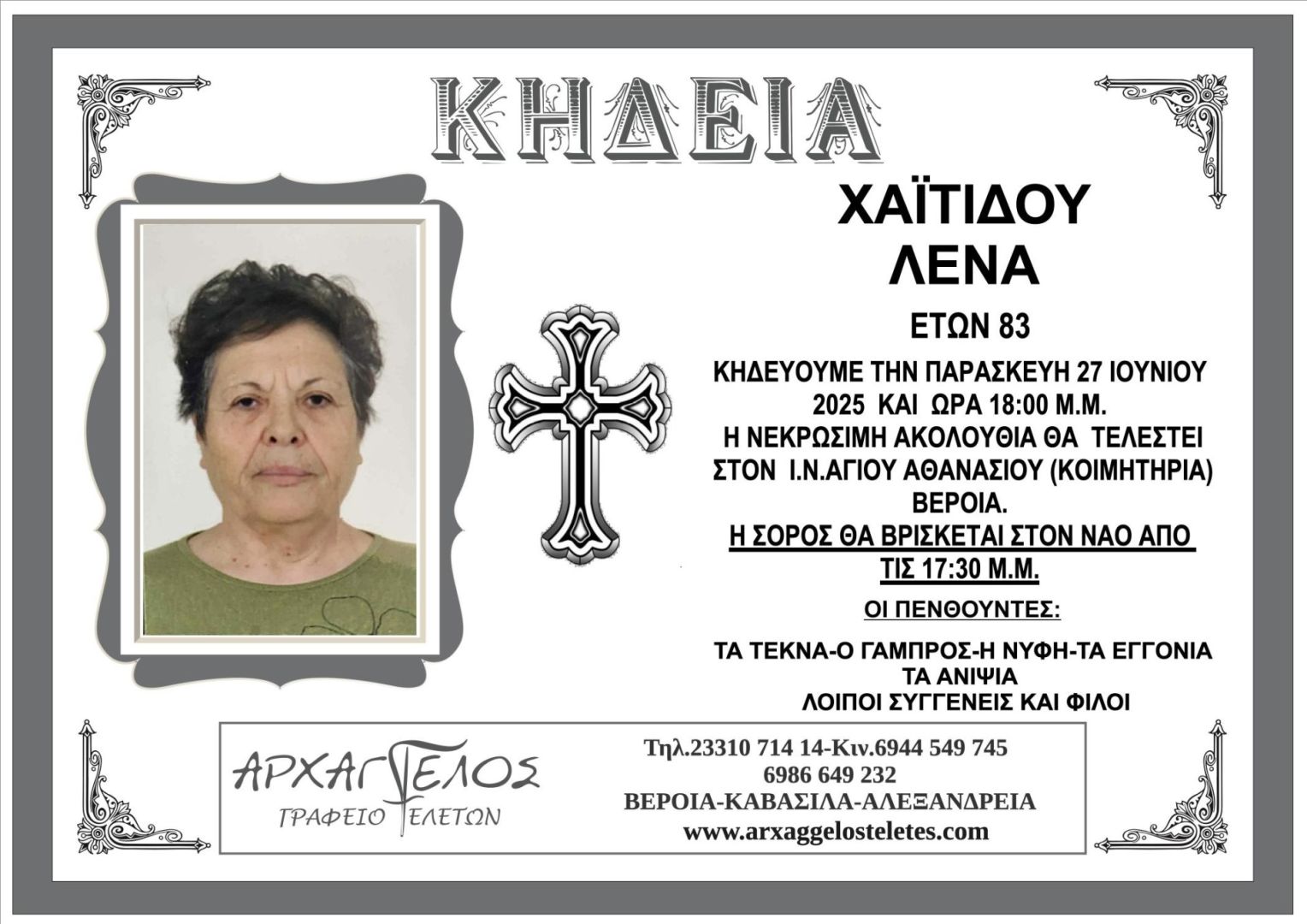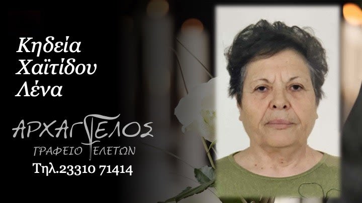 Έφυγε από τη ζωή και κηδεύεται σήμερα Παρασκευή 27 Ιουνίου 2025 στις 6.00 μ.μ. από τον Ιερό Ναό Αγίου Αθανασίου (Κοιμητήρια) Βέροιας η Λένα Χαϊτίδου σε ηλικία 83 ετών.