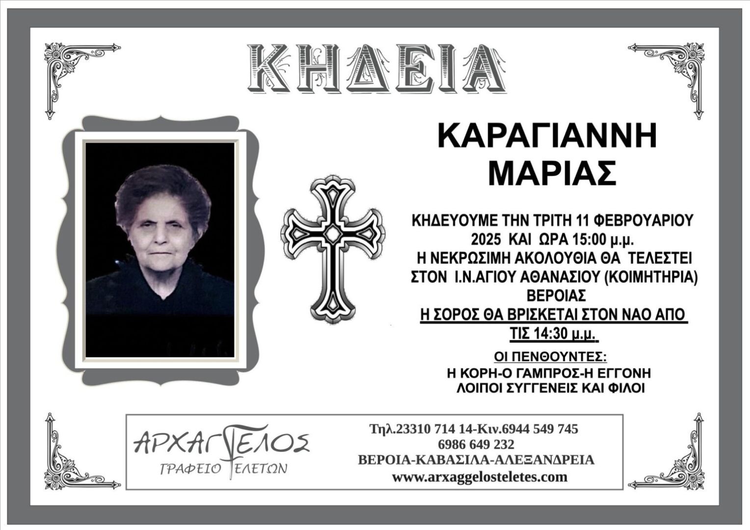 Έφυγε από τη ζωή και κηδεύτηκε σήμερα Τρίτη 11 Φεβρουαρίου 2025 στις 3.00 μ.μ. από τον Ιερό Ναό Αγίου Αθανασίου (Κοιμητήρια) Βέροιας η Μαρία Καραγιάννη.