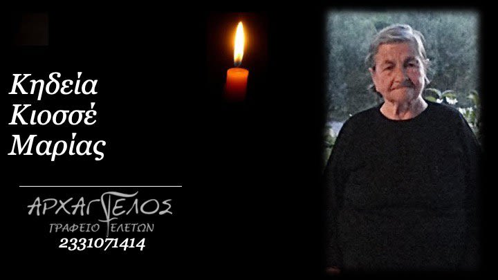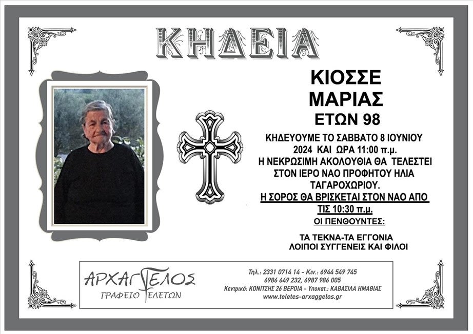 Έφυγε από τη ζωή και κηδεύεται το Σάββατο 8 Ιουνίου 2024 στις 11.00 π.μ. από τον Ιερό Ναό Προφήτου Ηλία Ταγαροχωρίου η Μαρία Κιοσσέ σε ηλικία 98 ετών.
