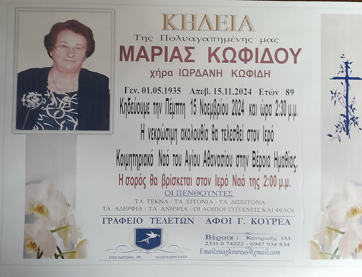 Έφυγε από τη ζωή και κηδεύτηκε σήμερα Πέμπτη 14 Νοεμβρίου 2024 στις 2.30 μ.μ. από τον Ιερό Ναό Αγίου Αθανασίου (Κοιμητήρια) Βέροιας η Μαρία Κωφίδου σε ηλικία 89 ετών.