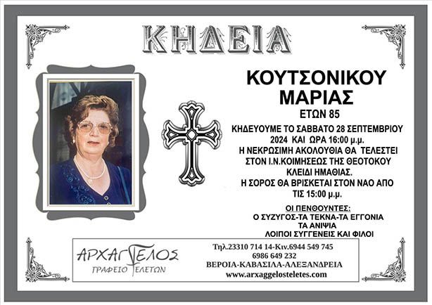 Έφυγε από τη ζωή και κηδεύεται σήμερα Σάββατο 28 Σεπτεμβρίου 2024 στις 4.00 μ.μ. από τον Ιερό Ναό Κοιμήσεως της Θεοτόκου Κλειδί Ημαθίας, η Μαρία Κουτσονίκου σε ηλικία 85 ετών.