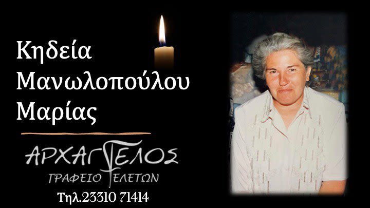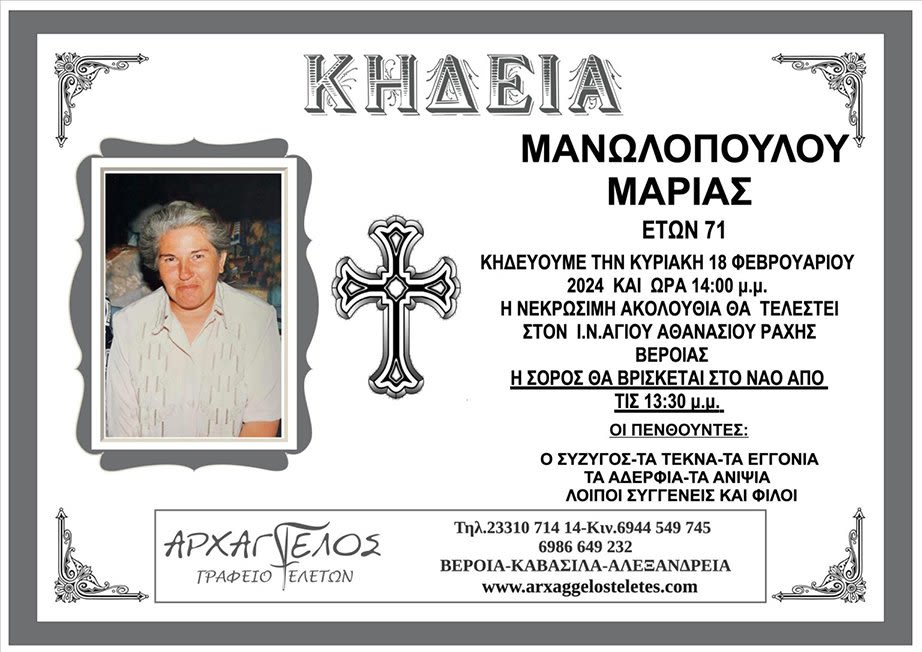 Έφυγε από τη ζωή και κηδεύεται την Κυριακή 18 Φεβρουαρίου 2024 στις 2.00 μ.μ. από τον Ιερό Ναό Αγίου Αθανασίου Ράχης Βέροιας η Μαρία Μανωλοπούλου σε ηλικία 71 ετών.