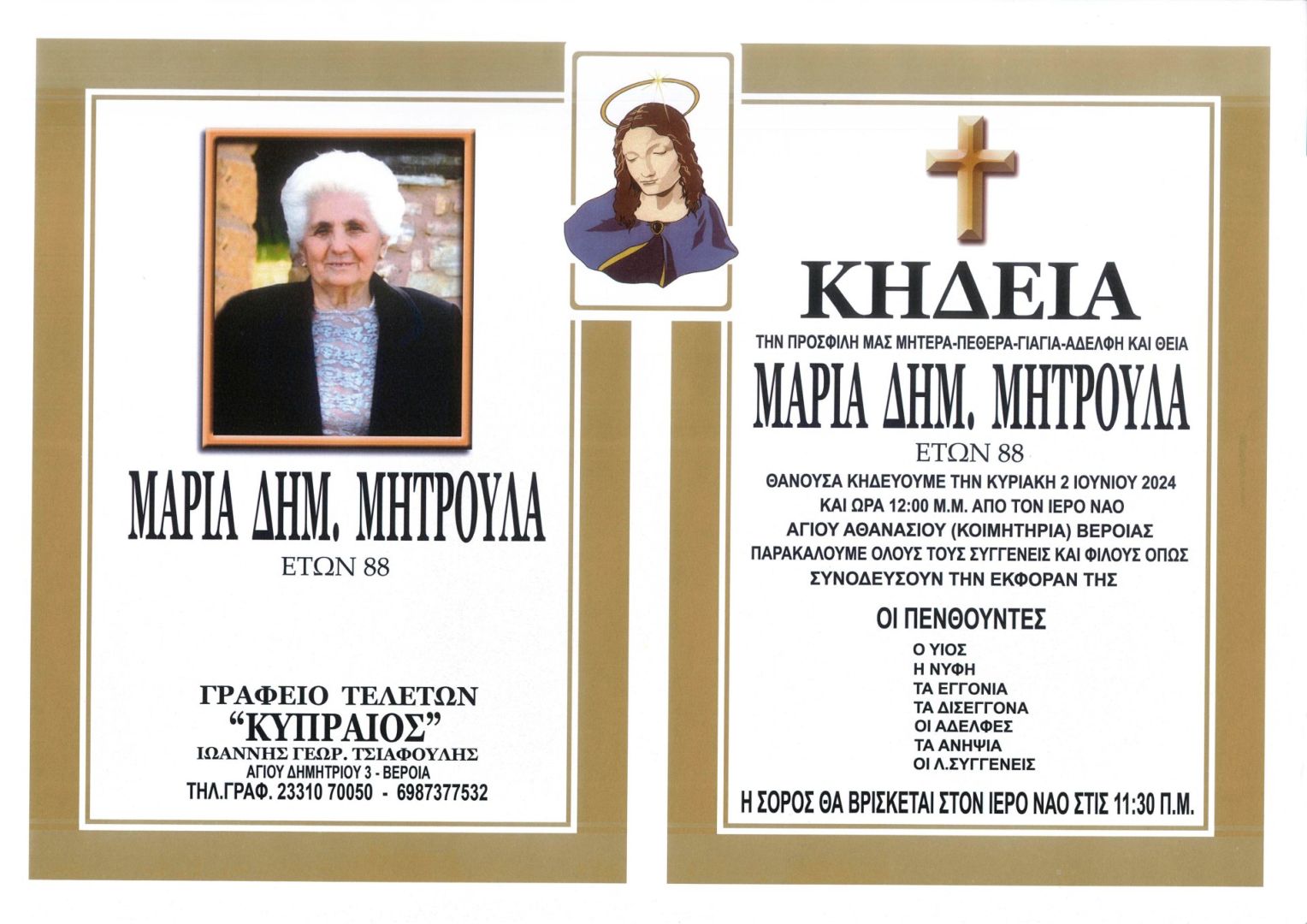 Έφυγε από τη ζωή και κηδεύεται την Κυριακή 2 Ιουνίου 2024 στις 12.00 μμ. από τον Ιερό Ναό Αγίου Αθανασίου (Κοιμητήρια) Βέροιας η Μαρία Δημ. Μητρουλα σε ηλικία 88 ετών.