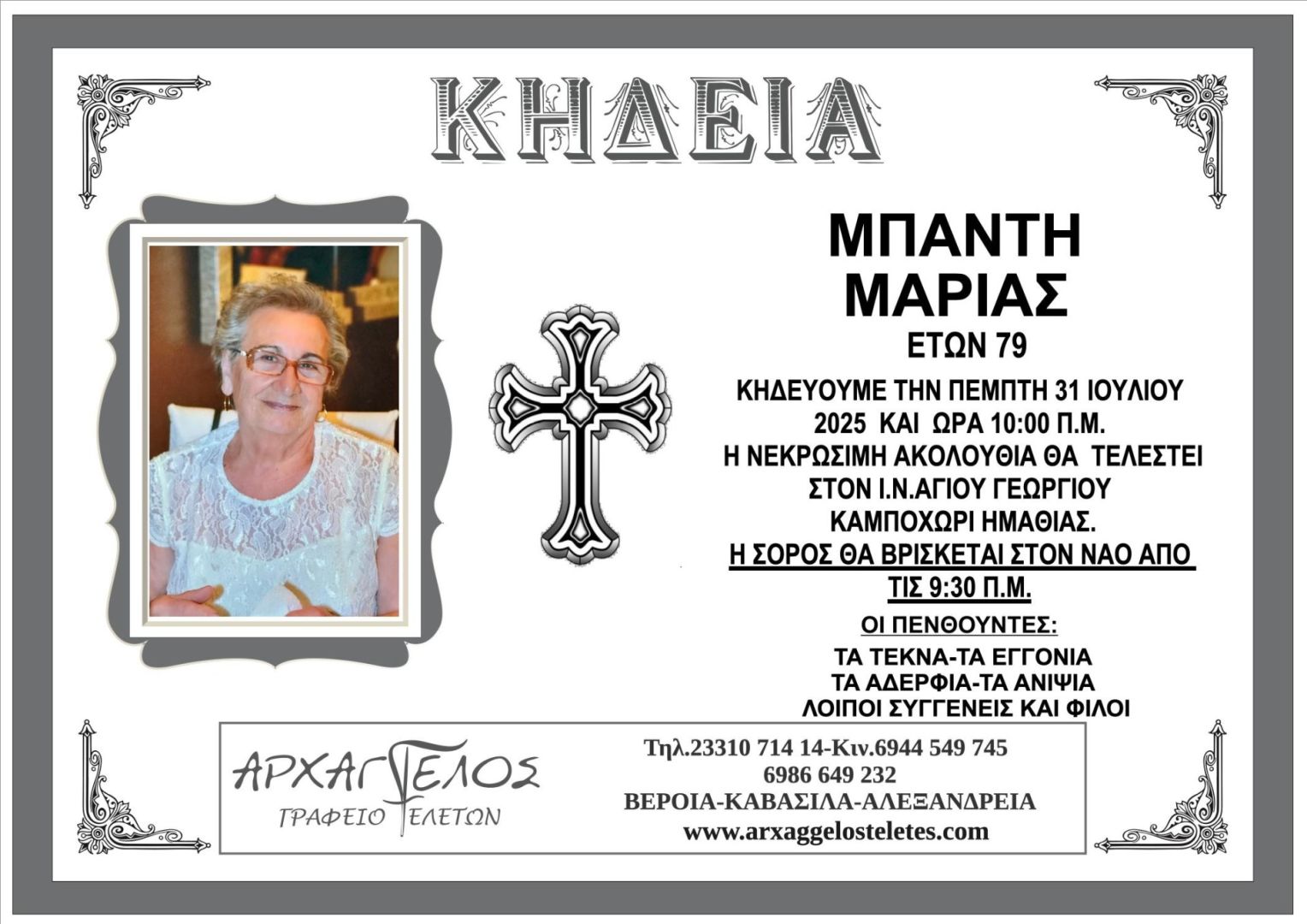 Έφυγε από τη ζωή και κηδεύεται την Πέμπτη 31 Ιουλίου 2025 στις 10.00 π.μ. από τον Ιερό Ναό Αγίου Γεωργίου στο Καμποχώρι Ημαθίας η Μαρία Μπαντή σε ηλικία 79 ετών.