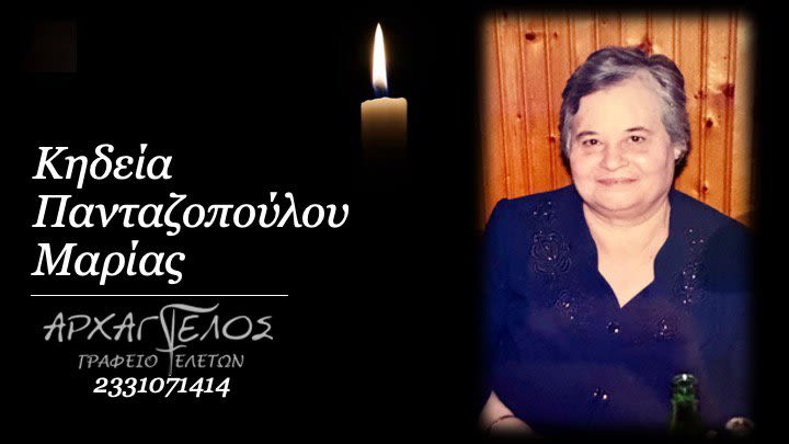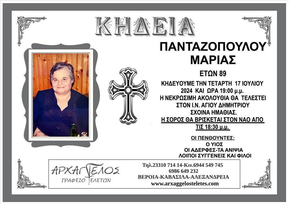 Έφυγε από τη ζωή και κηδεύεται σήμερα Τετάρτη 17 Ιουλίου 2024 στις 7.00 μ.μ. από τον Ιερό Ναό Αγίου Δημητρίου Σχοινά Ημαθίας η Μαρία Πανταζοπούλου σε ηλικία 89 ετών.