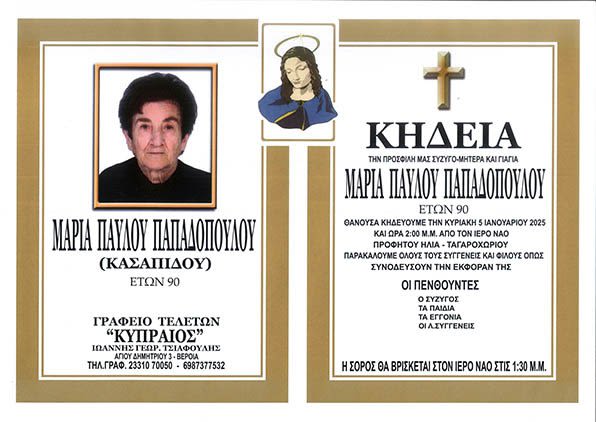 Έφυγε από τη ζωή και κηδεύεται αύριο Κυριακή 5 Ιανουαρίου 2025 στις 2.00 μ.μ. από τον Ιερό Ναό Προφήτου Ηλία – Ταγαροχωρίου, η Μαρία Παύλου Παπαδοπούλου (Κασαπίδου) σε ηλικία 90 ετών.