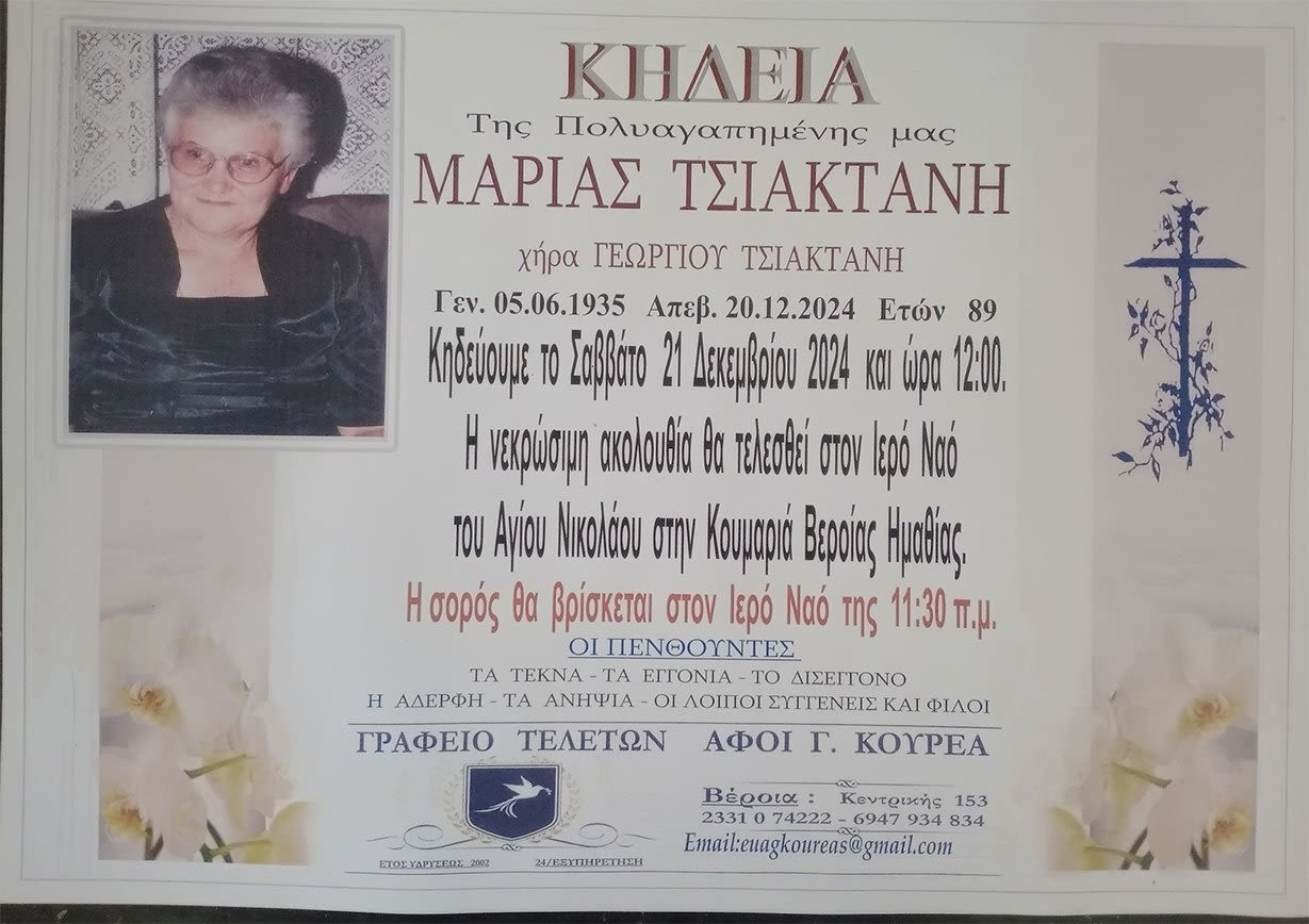 Έφυγε από τη ζωή και κηδεύεται το Σάββατο 21 Δεκεμβρίου 2024 στις 12.00 μ.μ. από τον Ιερό Ναό Αγίου Νικολάου στην Κουμαριά Βέροιας η Μαρία Τσιακτάνη σε ηλικία 89 ετών.