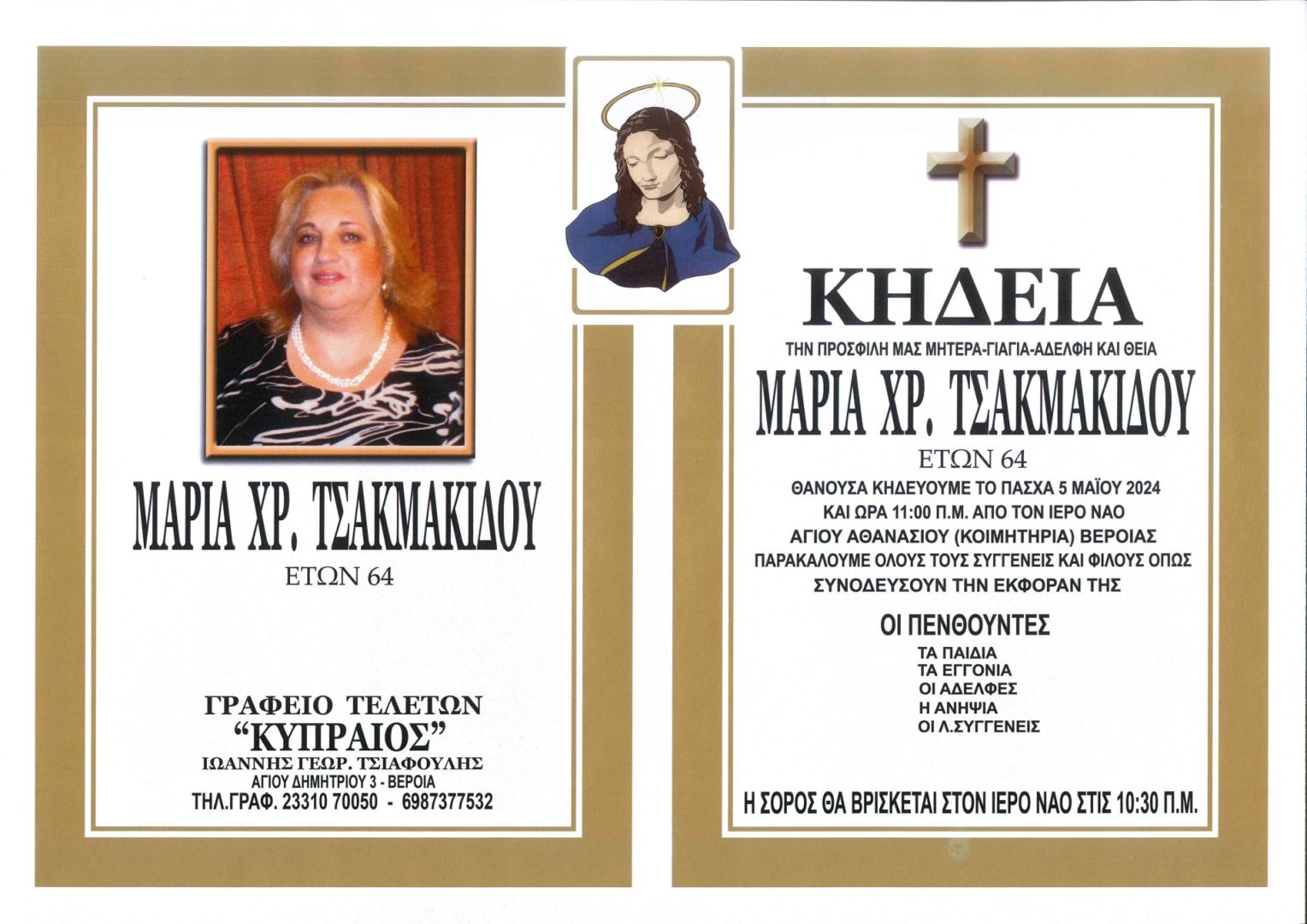 Έφυγε από τη ζωή και κηδεύεται το Πάσχα 5 Μαΐου 2024 στις 11.00 π.μ. από τον Ιερό Ναό Αγίου Αθανασίου (Κοιμητήρια) Βέροιας η Μαρία Χρ. Τσακμακίδου σε ηλικία 64 ετών.