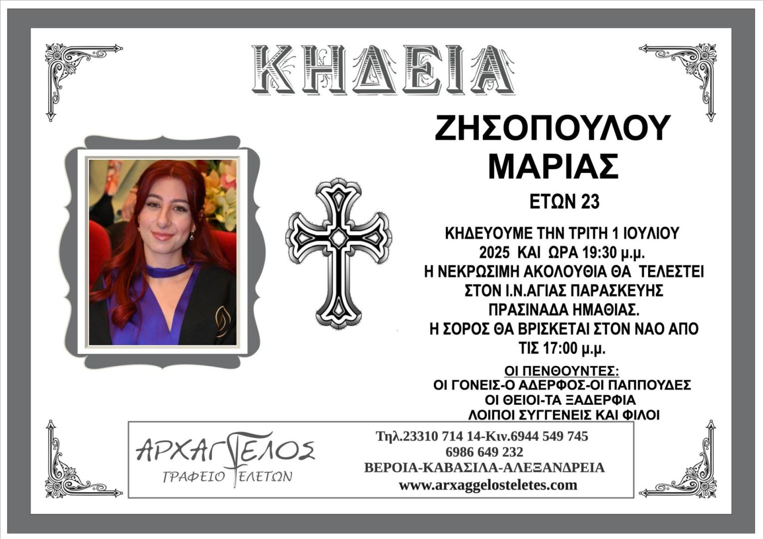 Έφυγε από τη ζωή και κηδεύεται σήμερα Τρίτη 1 Ιουλίου 2025 στις 7.30 μ.μ. από τον Ιερό Ναό Αγίας Παρασκευής Πρασινάδας Ημαθίας η Μαρία Ζησοπούλου σε ηλικία 23 ετών.