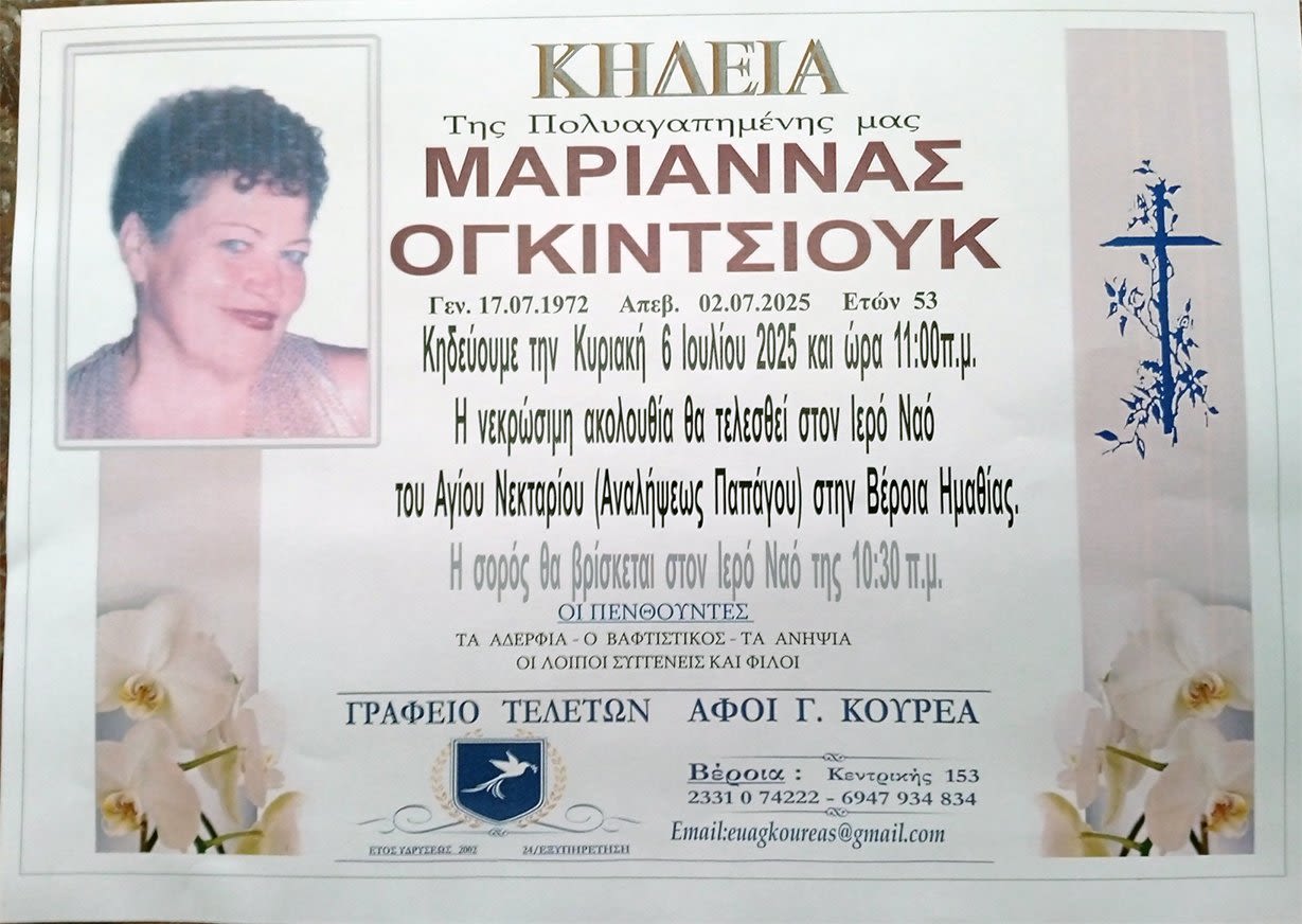 Έφυγε από τη ζωή και κηδεύεται την Κυριακή 6 Ιουλίου 2025 στις 11.00 π.μ. από τον Ιερό Ναό Αγίου Νεκταρίου (Αναλήψεως Παπάγου) Βέροιας η Μαριάννα Ογκιντσιούκ σε ηλικία 53 ετών.