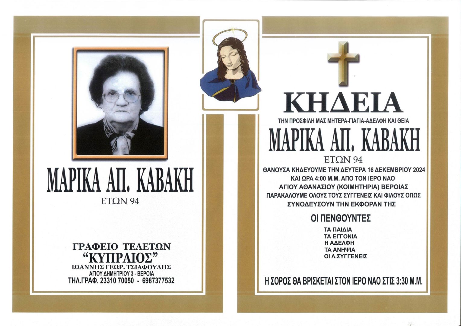 Έφυγε από τη ζωή και κηδεύτηκε σήμερα Δευτέρα 16 Δεκεμβρίου 2024 στις 4.00 μ.μ. από τον Ιερό Ναό Αγίου Αθανασίου (Κοιμητήρια) Βέροιας η Μαρίκα Απ. Καβάκη σε ηλικία 94 ετών.