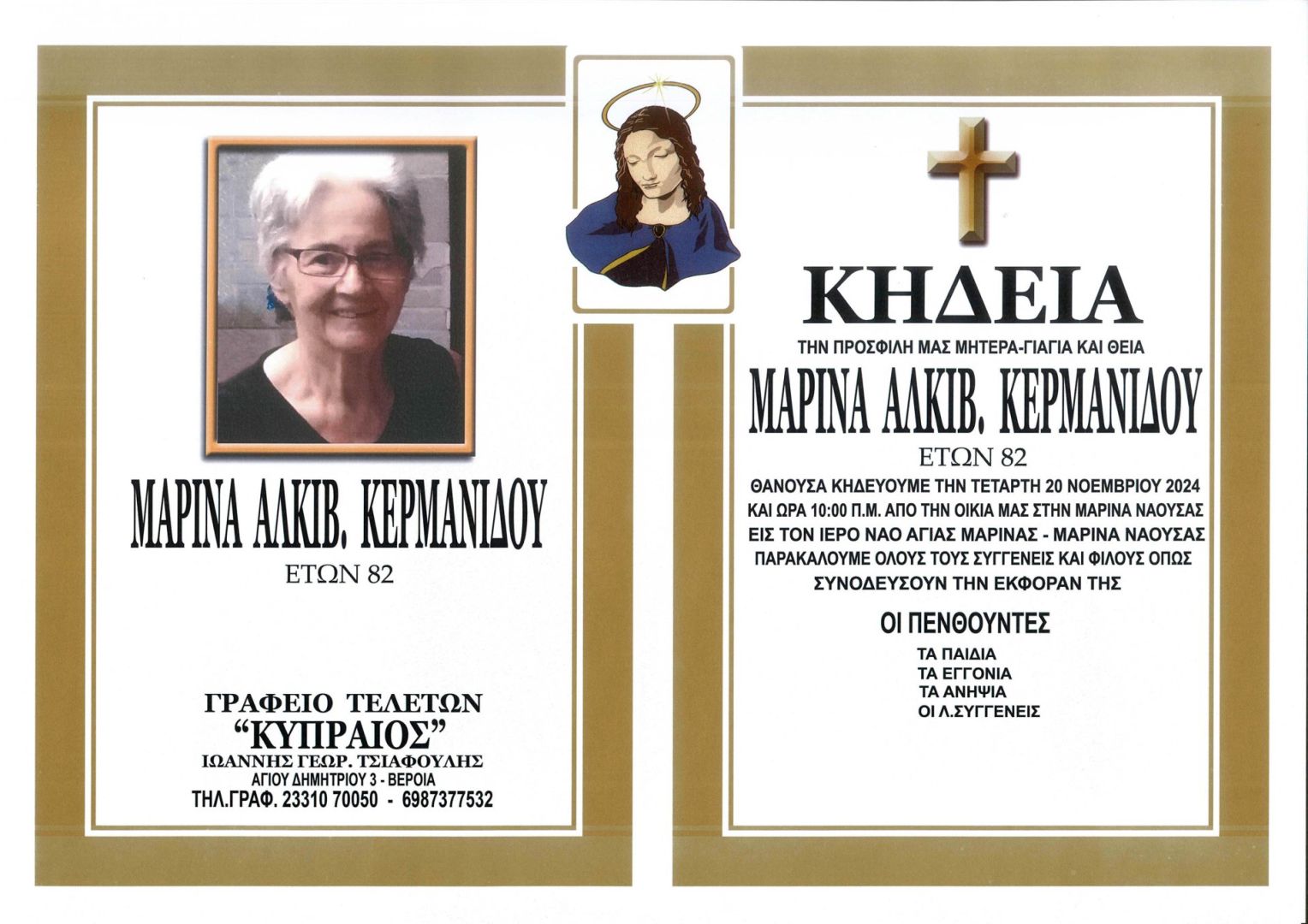 Έφυγε από τη ζωή και κηδεύτηκε την Τετάρτη 20 Νοεμβρίου 2024 στις 10.00 π.μ. από τον Ιερό Ναό Αγίας Μαρίνας στην Αγ. Μαρίνα Νάουσας η Μαρίνα Αλκιβ. Κερμανίδου σε ηλικία 82 ετών.