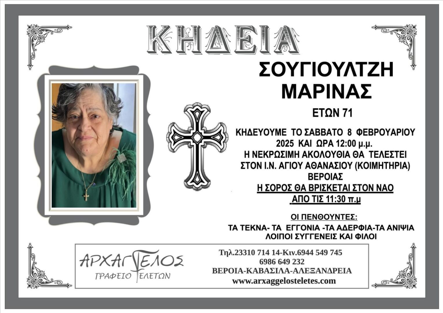 Έφυγε από τη ζωή και κηδεύεται το Σάββατο 8 Φεβρουαρίου 2025 στις 12.00 μ.μ. από τον Ιερό Ναό Αγίου Αθανασίου (Κοιμητήρια) Βέροιας η Μαρίνα Σουγιουλτζή σε ηλικία 71 ετών.