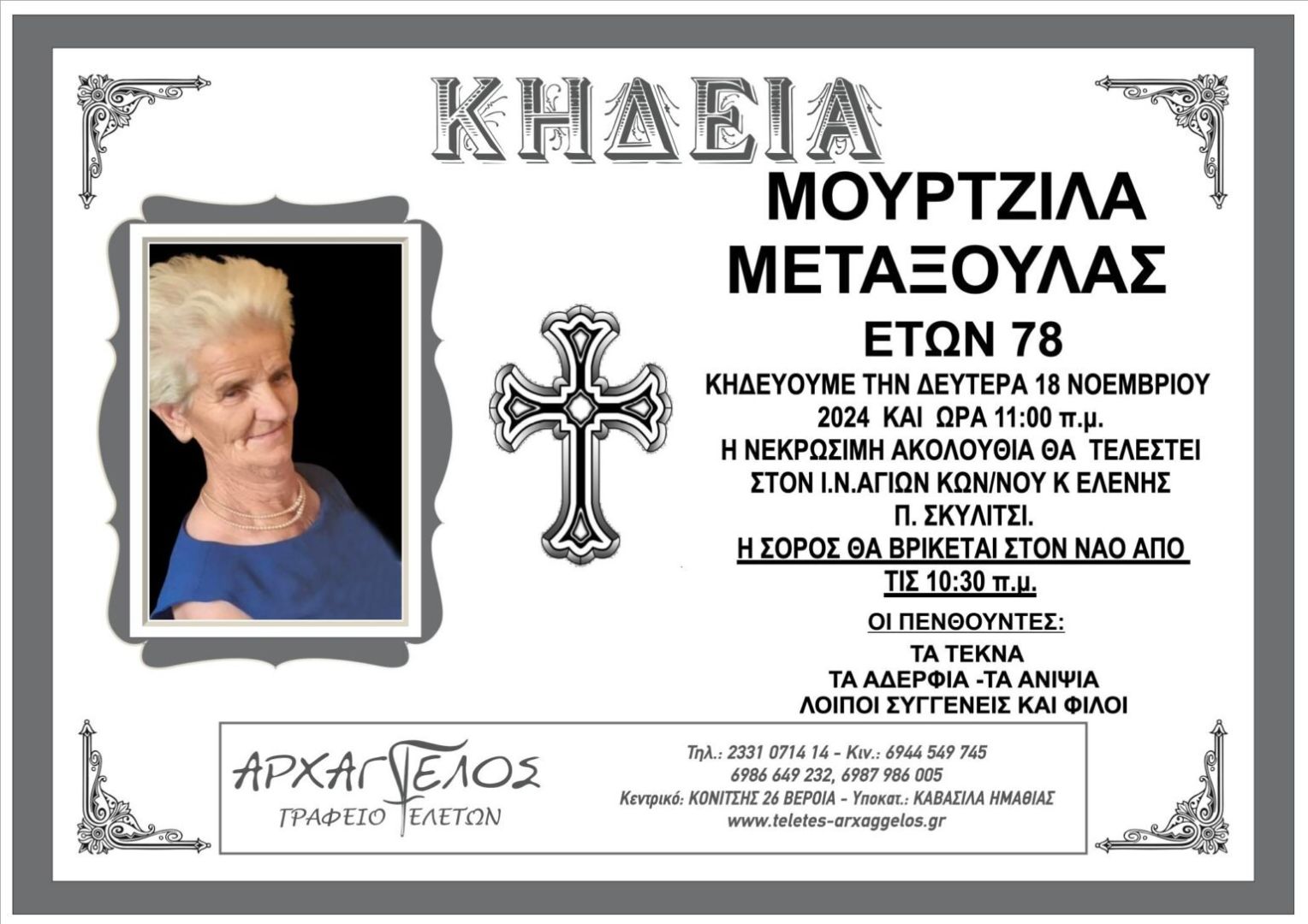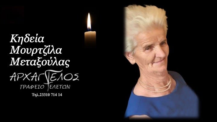 Έφυγε από τη ζωή και κηδεύεται την Δευτέρα 18 Νοεμβρίου 2024 στις 11.00 π.μ. από τον Ιερό Ναό Αγίων Κων/νου και Ελένης στο Π. Σκυλίτσι η Μεταξούλα Μουρτζίλα σε ηλικία 78 ετών.