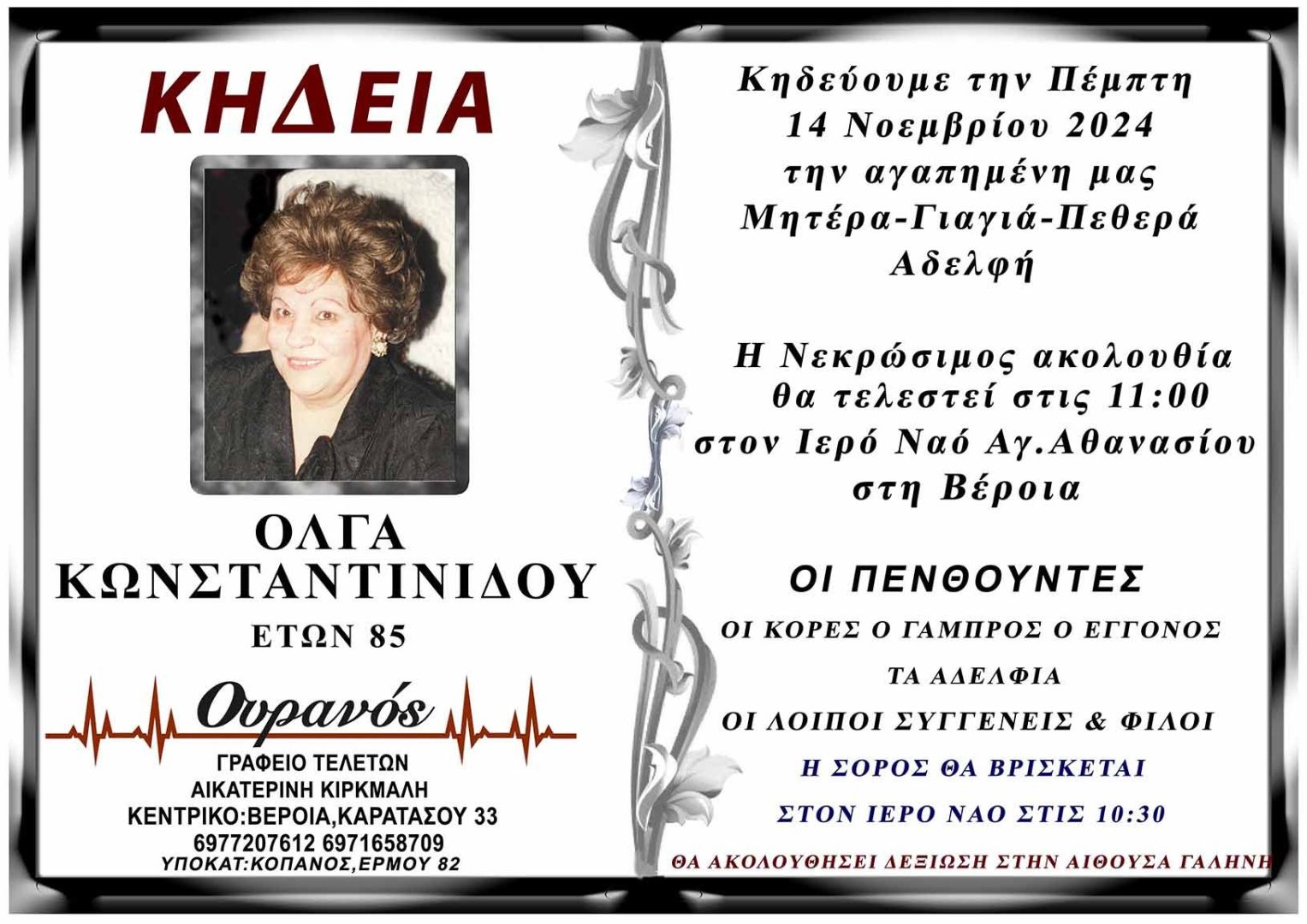 Έφυγε από τη ζωή και κηδεύεται την Πέμπτη 14 Νοεμβρίου 2024 στις 11.00 π.μ. από τον Ιερό Ναό Αγίου Αθανασίου (Κοιμητήρια) Βέροιας η Όλγα Κωνσταντινίδου σε ηλικία 85 ετών.