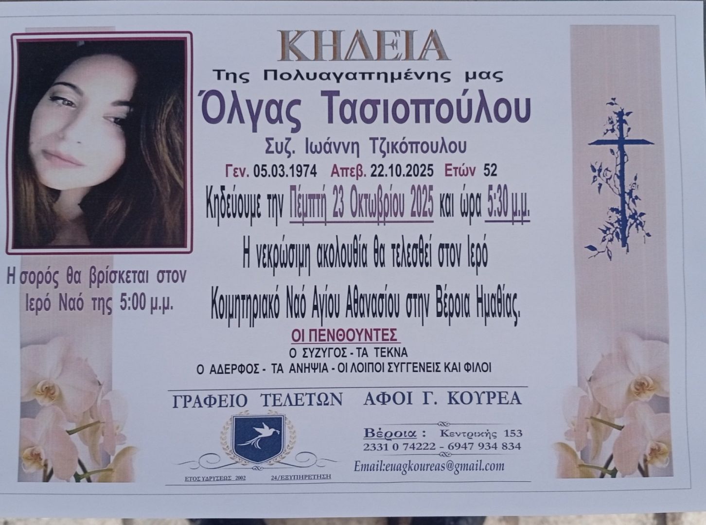 Έφυγε από τη ζωή και κηδεύεται σήμερα Πέμπτη 23 Οκτωβρίου 2025 στις 5.30 μ.μ. από τον Ιερό Ναό Αγίου Αθανασίου (Κοιμητήρια) Βέροιας η Όλγα Τασιοπούλου σε ηλικία 52 ετών.