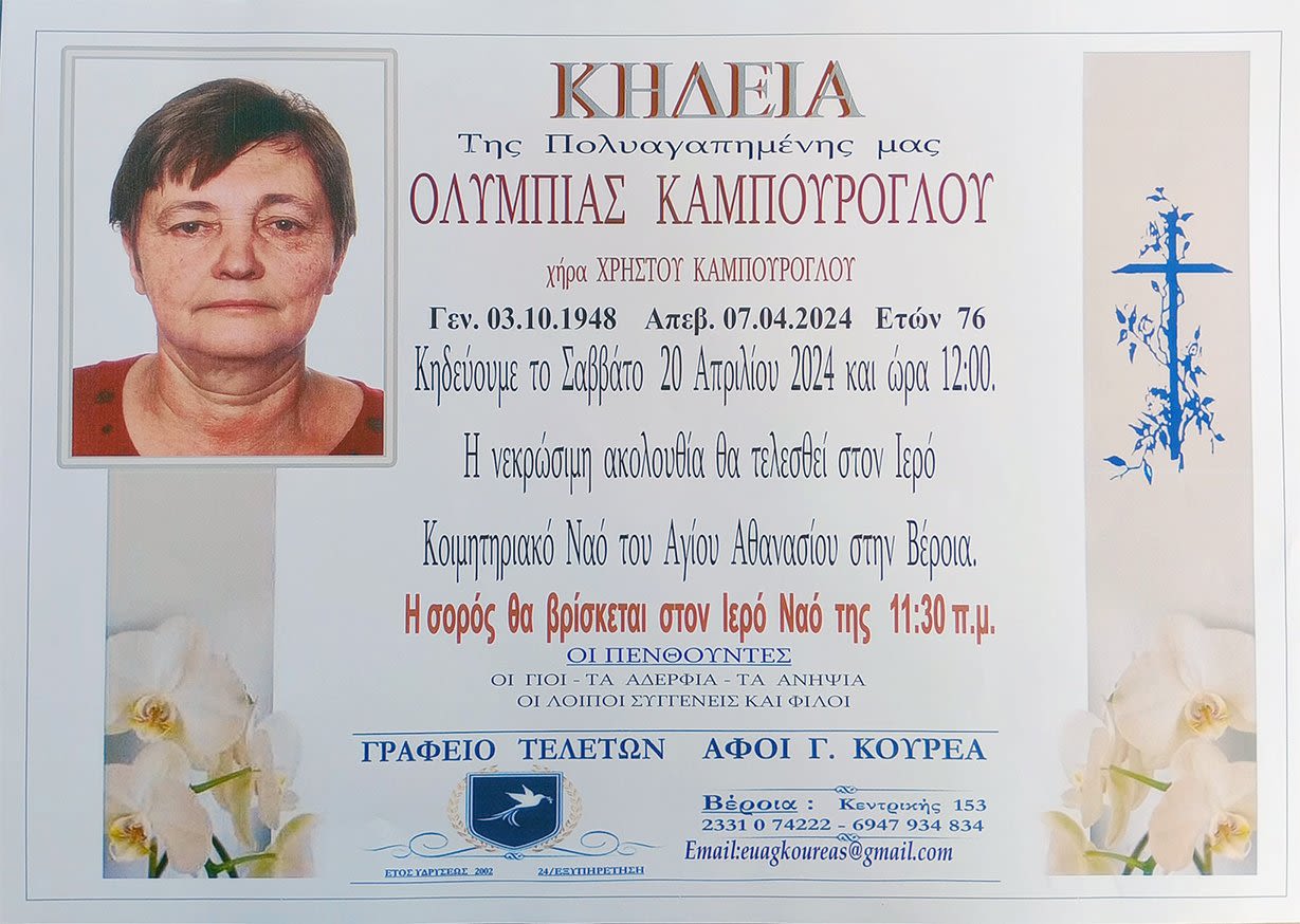 Έφυγε από τη ζωή και κηδεύεται το Σάββατο 20 Απριλίου 2024 στις 12.00 μ.μ. από τον Ιερό Ναό Αγίου Αθανασίου (Κοιμητήρια) Βέροιας η Ολυμπία Καμπούρογλου σε ηλικία 76 ετών.