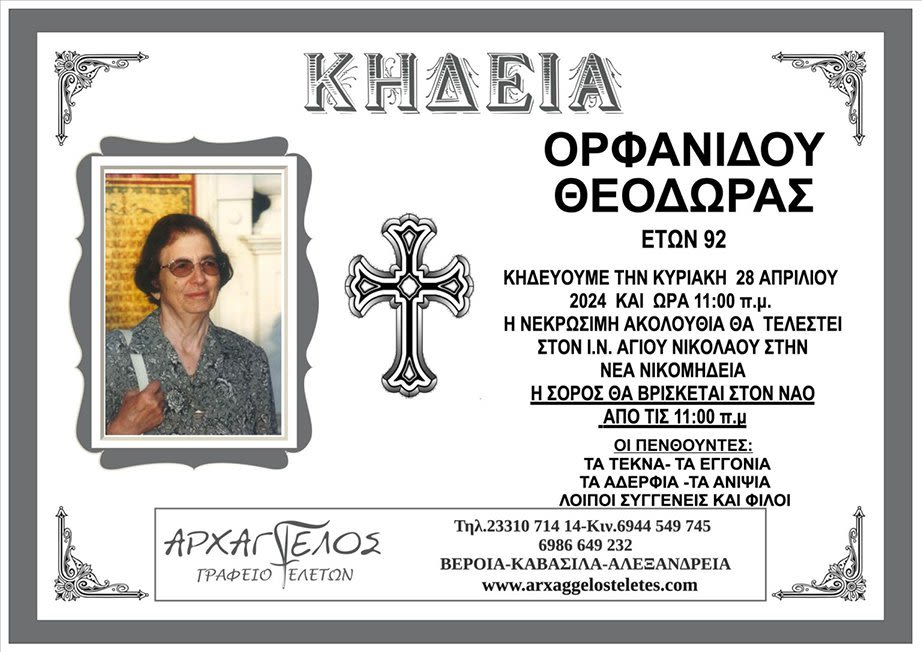 ‘Εφυγε από τη ζωή και κηδεύεται σήμερα Κυριακή 28 Απριλίου 2024 στις 11.00 π.μ. από τον Ιερό Ναό Αγίου Νικολάου στην Νέα Νικομήδεια η Ορφανίδου Θεοδώρα σε ηλικία 92 ετών.