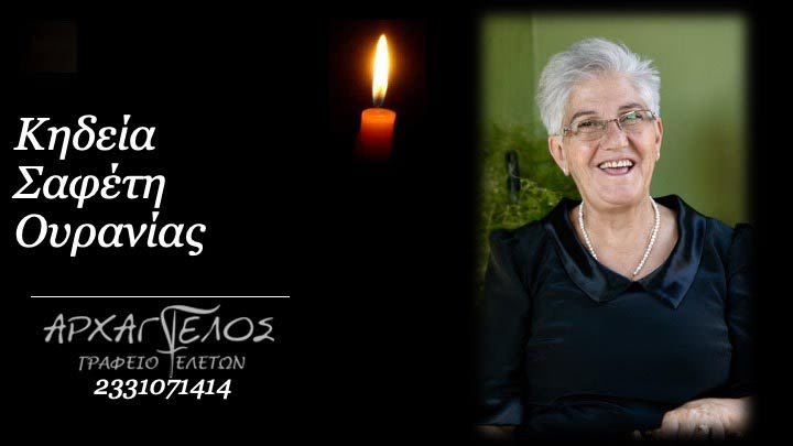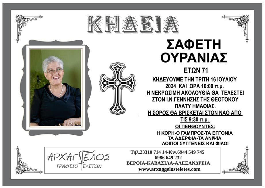Έφυγε από τη ζωή και κηδεύεται την Τρίτη 16 Ιουλίου 2024 στις 10:00 π.μ. από τον ιερό ναό Γέννησης της Θεοτόκου στο Πλατύ Ημαθίας, η Ουρανία Σαφέτη σε ηλικία 71 ετών.