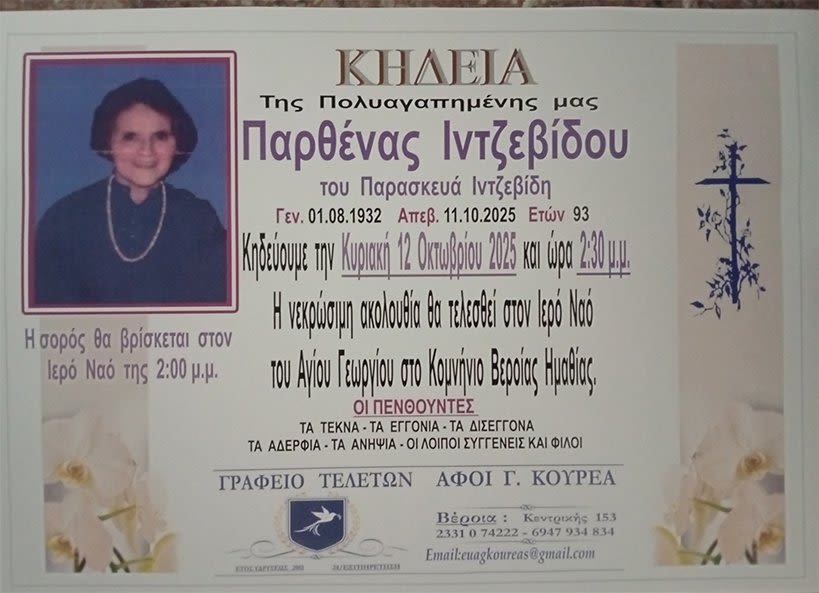 Έφυγε από τη ζωή και κηδεύεται την Κυριακή 12 Οκτωβρίου 2025 στις 2.30 μμ. από τον Ιερό Ναό Αγίου Γεωργίου στο Κομνήνιο Βέροιας η Παρθένα Ιντζεβίδου σε ηλικία 93 ετών.