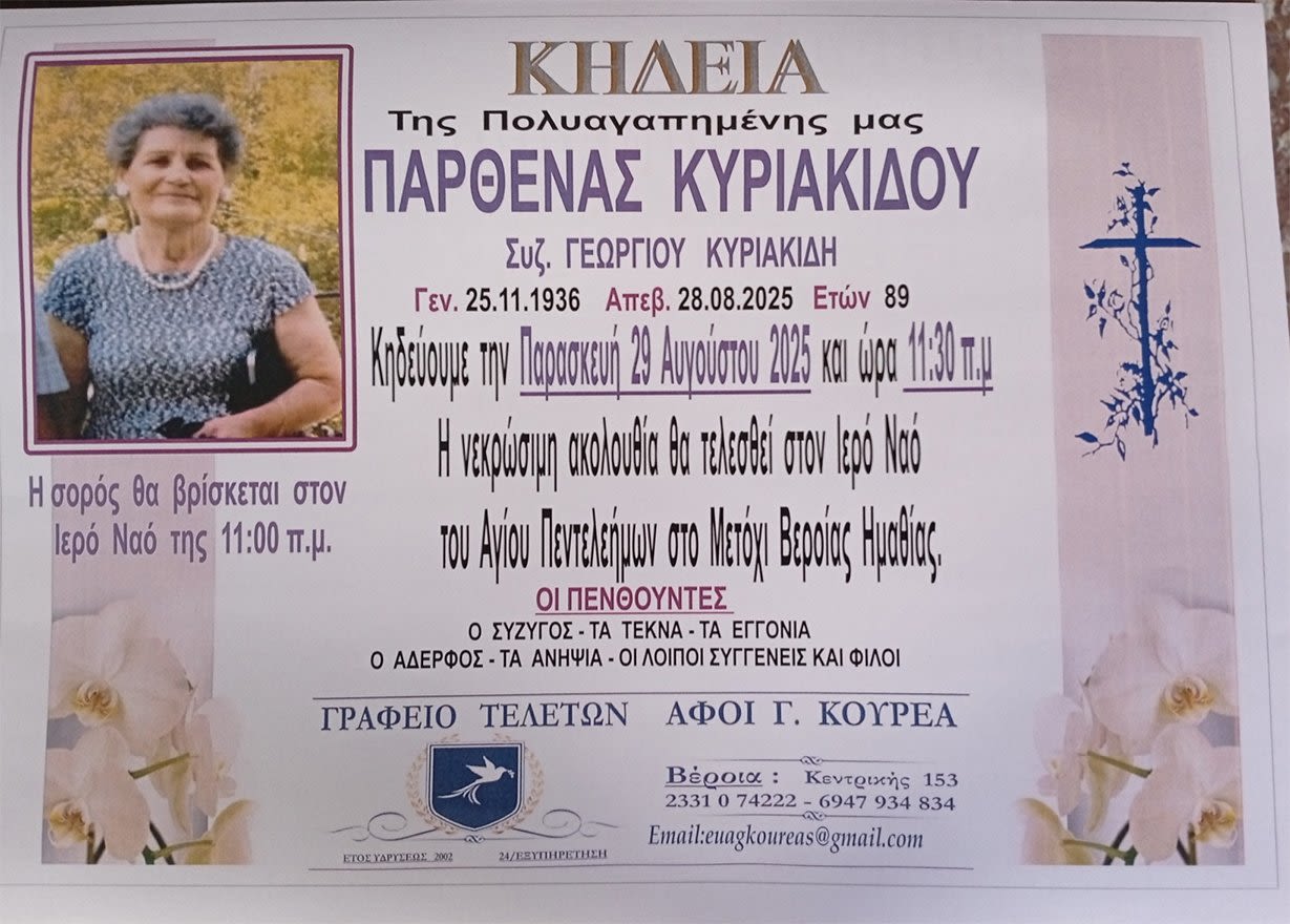 Έφυγε από τη ζωή και κηδεύεται την Παρασκευή 29 Αυγούστου 2025 στις 11.30 π.μ. από τον Ιερό Ναό Αγίου Παντελεήμων στο Μετόχι Βέροιας η Παρθένα Κυριακίδου σε ηλικία 89 ετών.