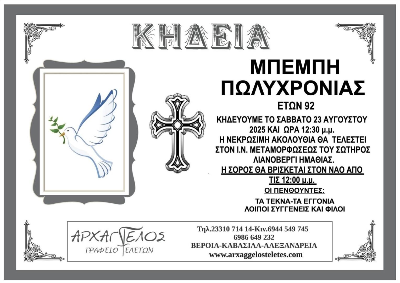 Έφυγε από τη ζωή και κηδεύεται το Σάββατο 23 Αυγούστου 2025 στις 12.30 μ.μ. από τον Ιερό Ναό Μεταμορφώσεως του Σωτήρος στο Λιανοβέργι Ημαθίας η Πολυχρονία Μπέμπη σε ηλικία 92 ετών.