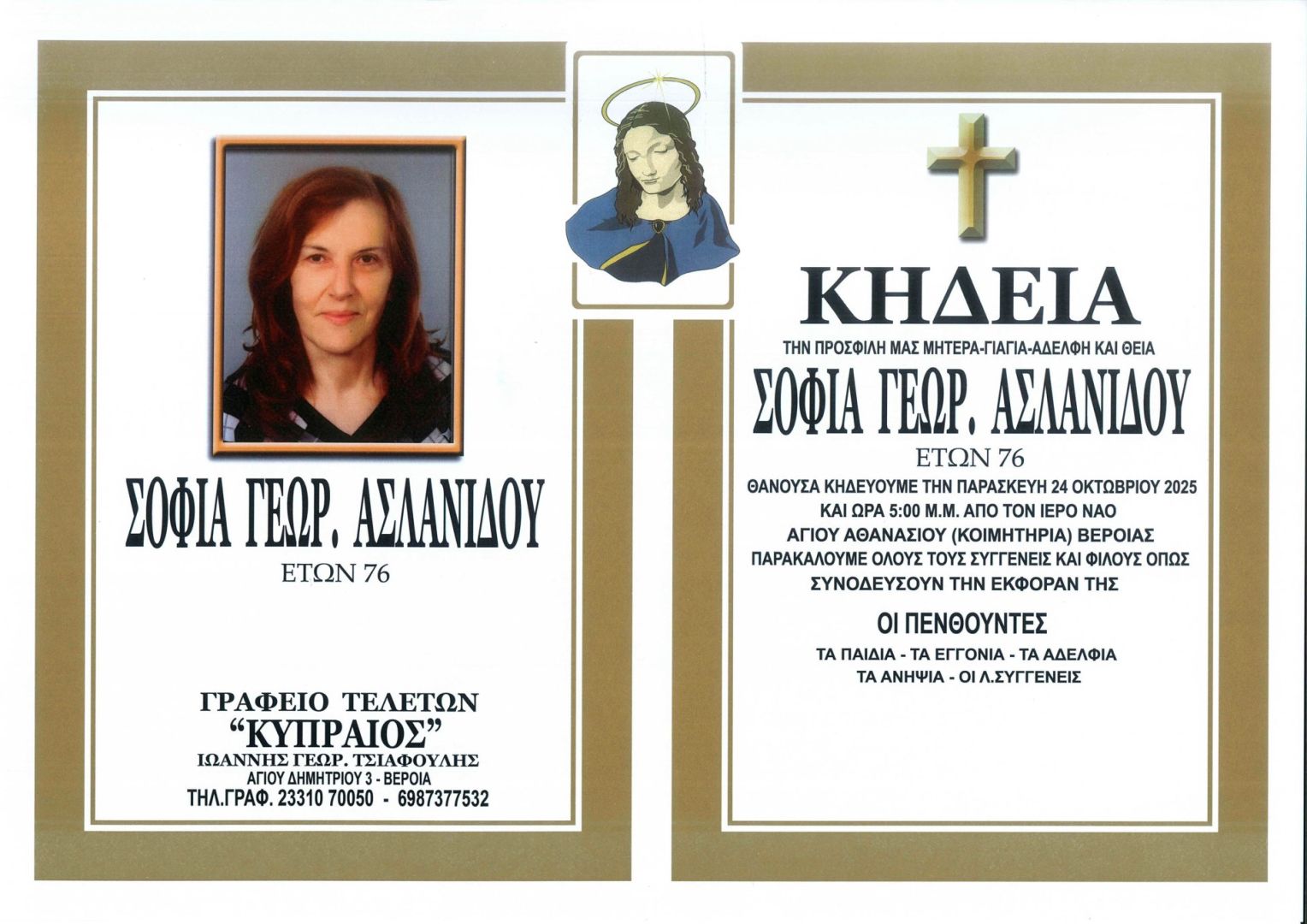 Έφυγε από τη ζωή και κηδεύεται την Παρασκευή 24 Οκτωβρίου 2025 στις 5.00 μ.μ. από τον Ιερό Ναό Αγίου Αθανασίου (Κοιμητήρια) Βέροιας η Σοφία Γεωρ. Ασλανίδου σε ηλικία 76 ετών.