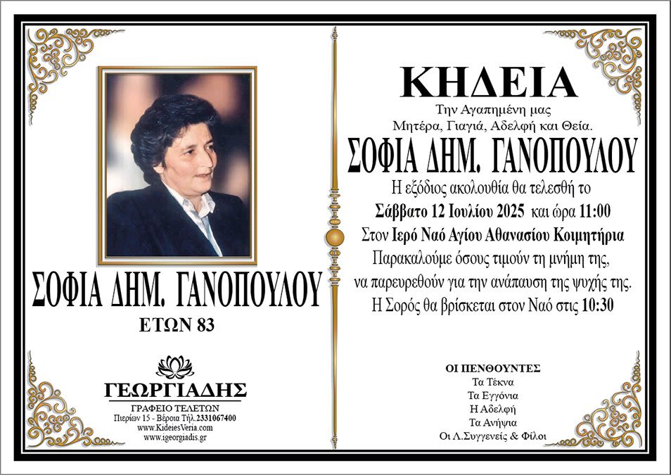 Έφυγε από τη ζωή και κηδεύεται το Σάββατο 12 Ιουλίου 2025 στις 11.00 π.μ. από τον Ιερό Ναό Αγίου Αθανασίου (Κοιμητήρια) Βέροιας η Σοφία Δημ. Γανοπούλου σε ηλικία 83 ετών.