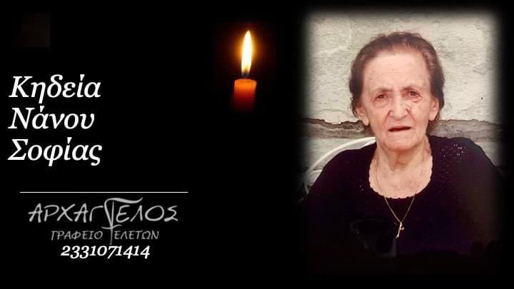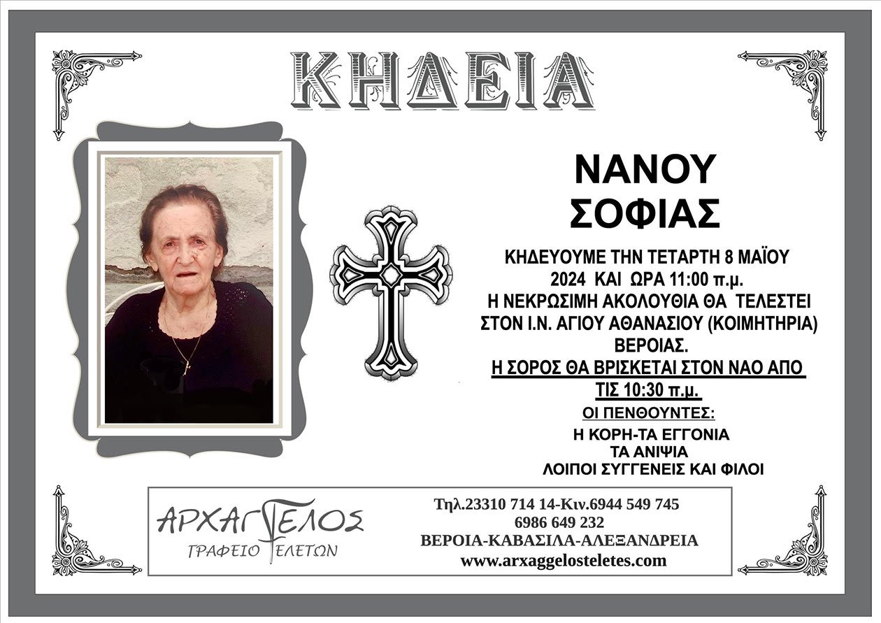 Έφυγε από τη ζωή και κηδεύεται την Τετάρτη 8 Μαΐου 2024 στις 11.00 π.μ. από τον Ιερό Ναό Αγίου Αθανασίου (Κοιμητήρια) Βέροιας η Σοφία Νάνου.