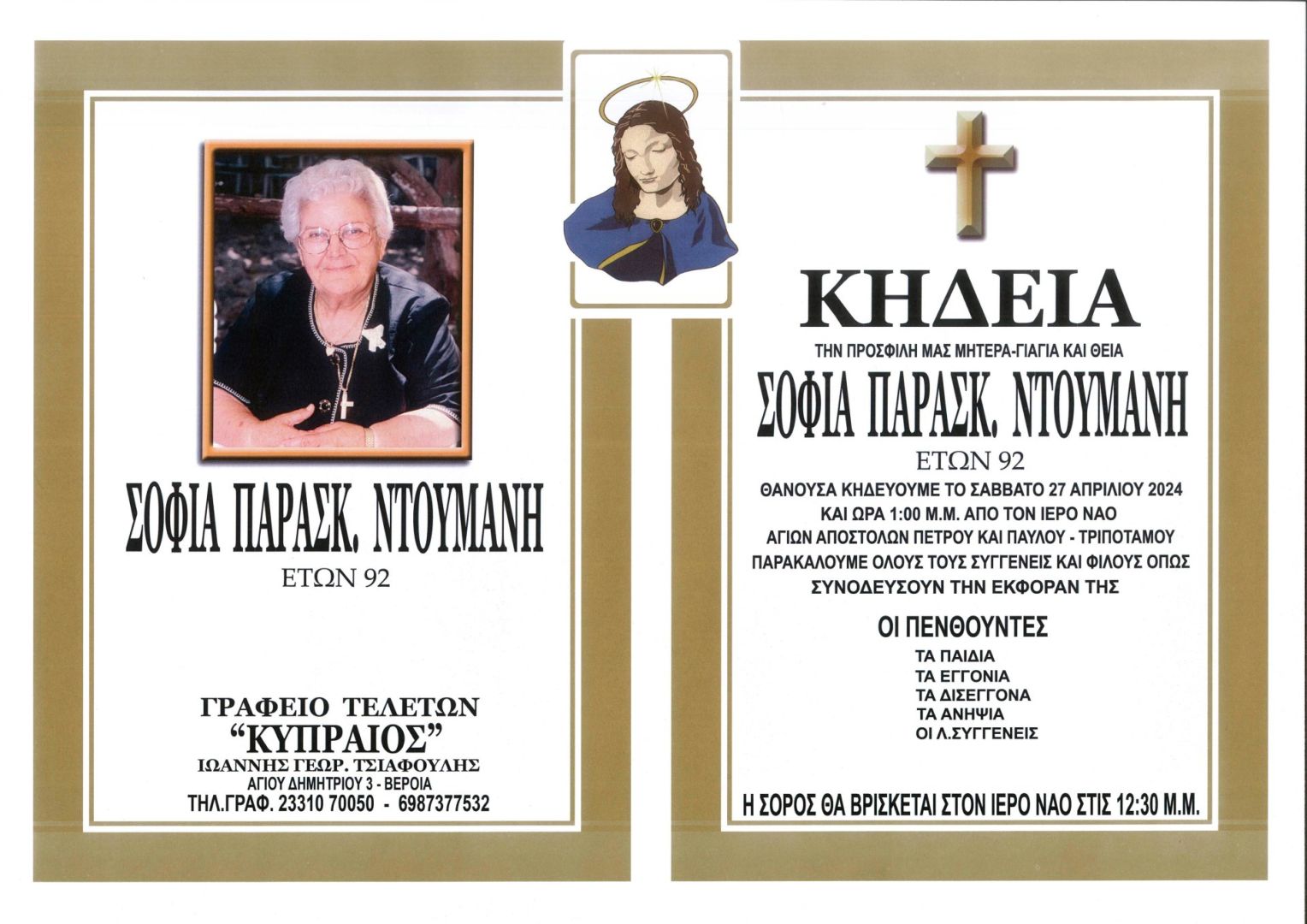 Έφυγε από τη ζωή και κηδεύεται το Σάββατο 27 Απριλίου 2024 στις 1.00 μ.μ. από τον Ιερό Ναό Αγίων Αποστόλων Πέτρου και Παύλου Τριποτάμου η Σοφία Παρασκ. Ντουμάνη σε ηλικία 92 ετών.@@ads-588@@