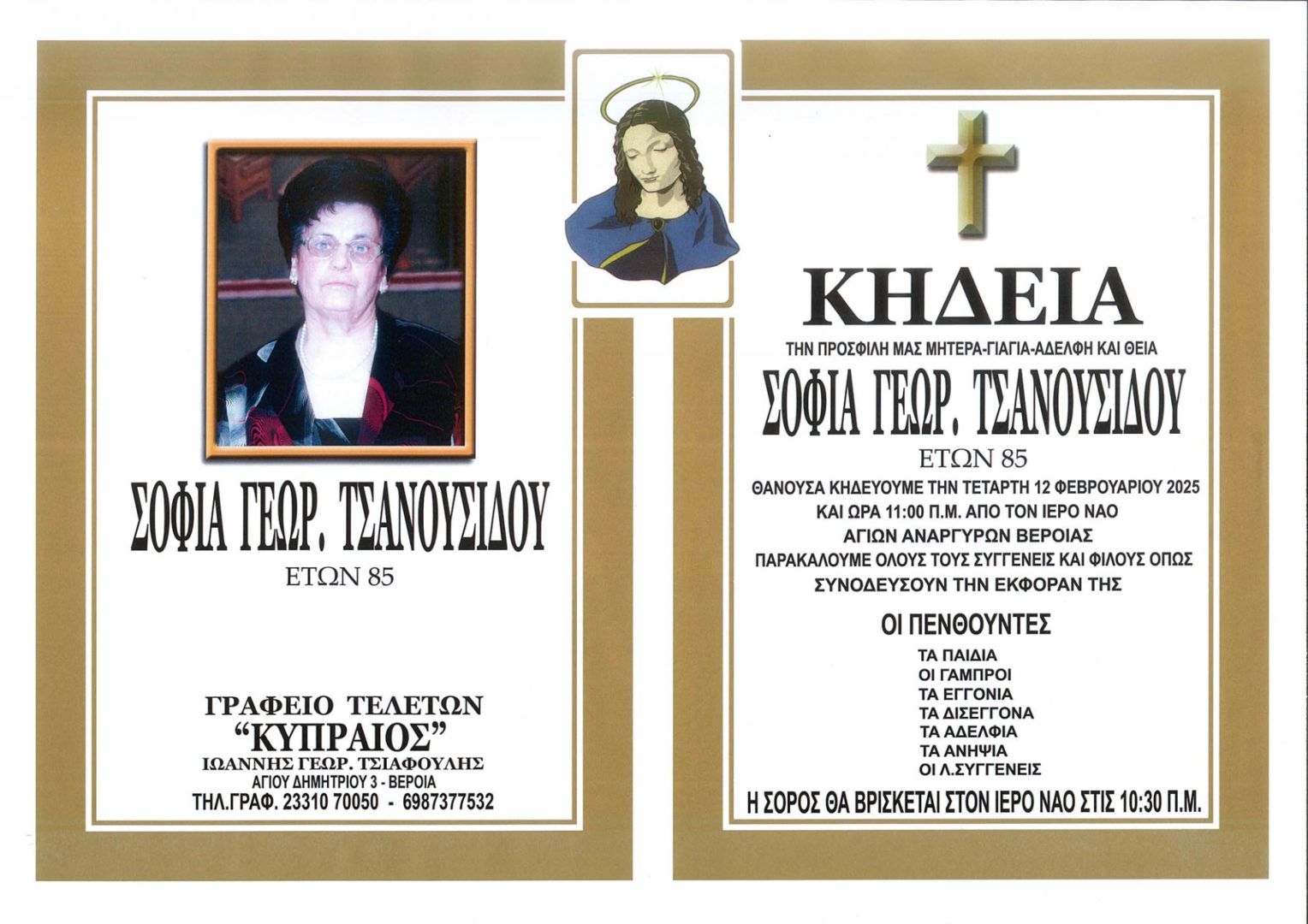 Έφυγε από τη ζωή και κηδεύεται την Τετάρτη 12 Φεβρουαρίου 2025 στις 11.00 π.μ. από τον Ιερό Ναό Αγίων Αναργύρων Βέροιας η Σοφία Γεωρ. Τσανουσίδου σε ηλικία 85 ετών.