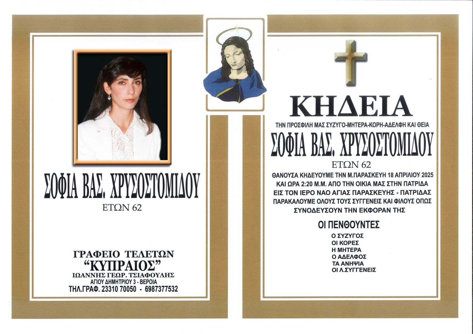 Έφυγε από τη ζωή και κηδεύεται σήμερα Μ. Παρασκευή 18 Απριλίου 2025 στις 2.20 μ.μ. από τον Ιερό Ναό Αγίας Παρασκευής Πατρίδας η Σοφία Βασ. Χρυσοστομίδου σε ηλικία 62 ετών.