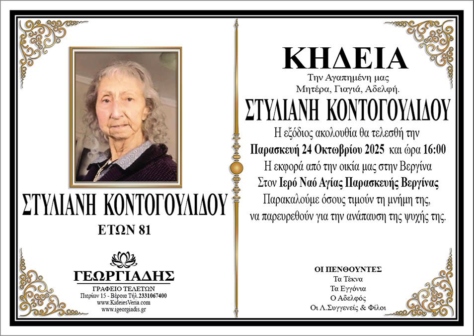 Έφυγε από τη ζωή και κηδεύτηκε σήμερα Παρασκευή 24 Οκτωβρίου 2025 στις 4.00 μ.μ. από τον Ιερό Ναό Αγίας Παρασκευής Βεργίνας η Στυλιανή Κοντογουλίδου σε ηλικία 81 ετών.