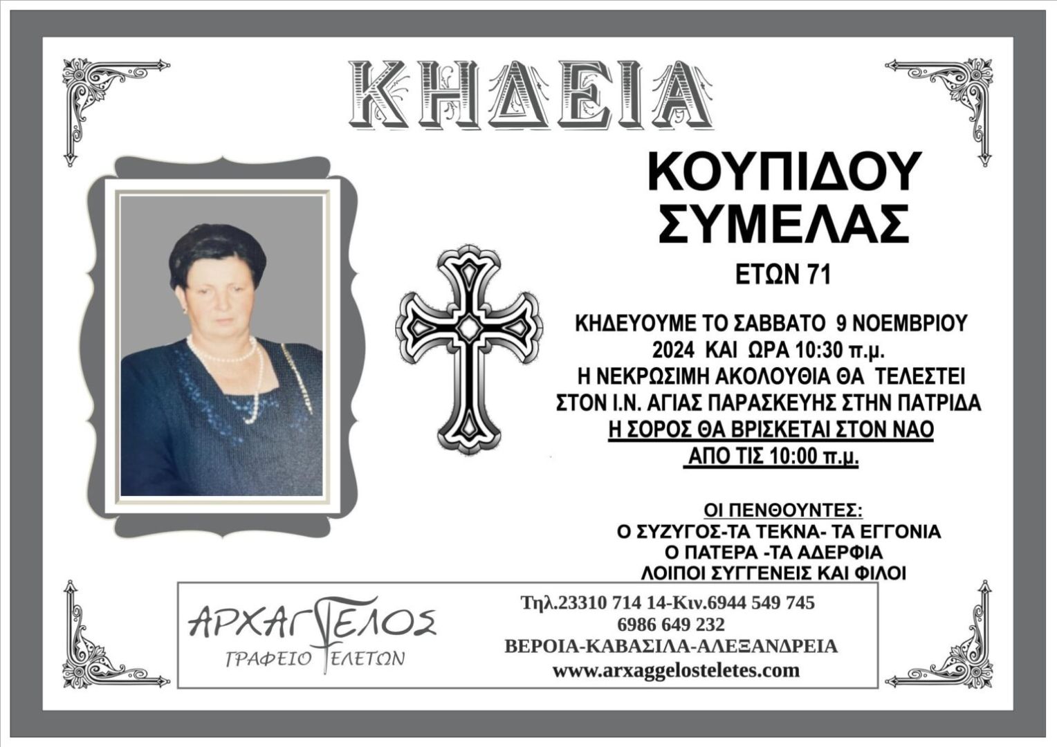 Έφυγε από τη ζωή και κηδεύεται το Σάββατο 9 Νοεμβρίου 2024 στις 10.30 π.μ. από τον Ιερό Ναό Αγίας Παρασκευής στην Πατρίδα η Συμέλα Κουπίδου σε ηλικία 71 ετών.