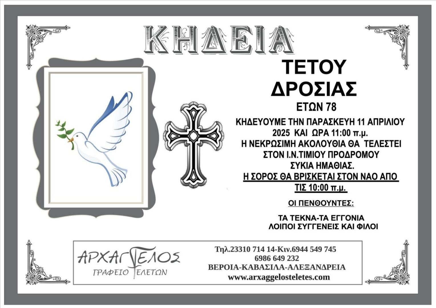 Έφυγε από τη ζωή και κηδεύεται σήμερα Παρασκευή 11 Απριλίου 2025 στις 11.00 π.μ. από τον Ιερό Ναό Τιμίου Προδρόμου Συκιάς Ημαθίας η Τέτου Δροσιά σε ηλικία 78 ετών.