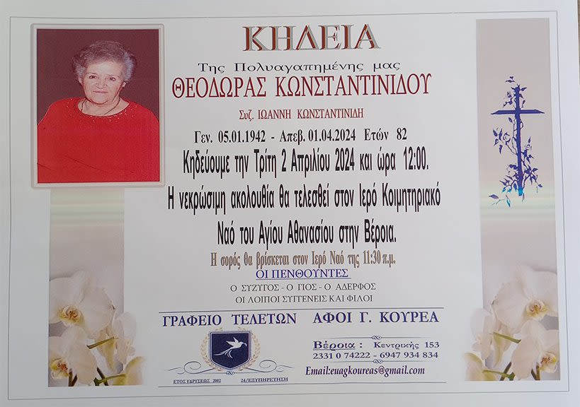 Έφυγε από τη ζωή και κηδεύεται την Τρίτη 2 Απριλίου 2024 στις 12.00 μ.μ. από τον Ιερό Ναό Αγίου Αθανασίου (Κοιμητήρια) Βέροιας η Θεοδώρα Κωνσταντινίδου σε ηλικία 82 ετών.