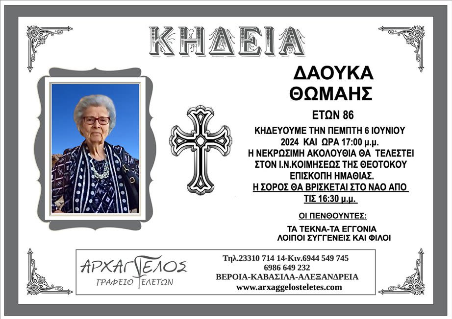Έφυγε από τη ζωή και κηδεύεται την Πέμπτη 6 Ιουνίου 2024 στις 5.00 μ.μ. από τον Ιερό Ναό Κοιμήσεως της Θεοτόκου στην Επισκοπή Ημαθίας.