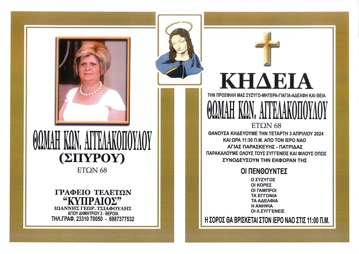 Έφυγε από τη ζωή και κηδεύεται την Τετάρτη 3 Απριλίου 2024 στις 11.30 π.μ. από τον Ιερό Ναό Αγίας Παρασκευής Πατρίδας η Θωμαή Κων. Αγγελακοπούλου-Σπύρου σε ηλικία 68 ετών.